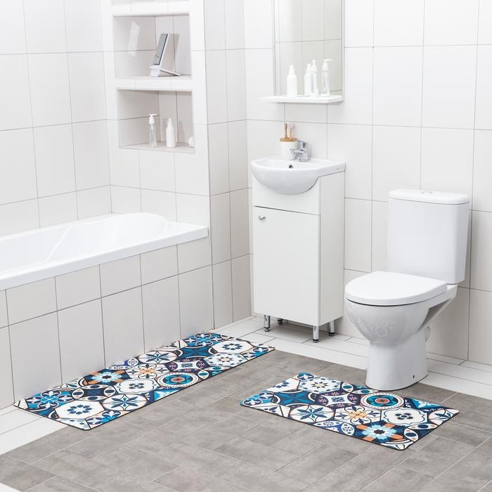 Набор ковриков для ванны и туалета Доляна «Мистери», 2 шт: 45×75, 45×120 см, цвет синий