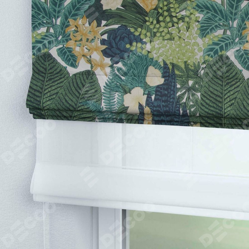 Римская штора день-ночь производителя «Cortin», используется для проёма, пошита из двух полотен, с лицевой стороны «Джунгли», вторая ткань тюль (по стандарту комплектуется тюль белого цвета артикул V-01). Имеет универсальный механизм и подходит для монтажа: на потолок, на стену и в нишу.