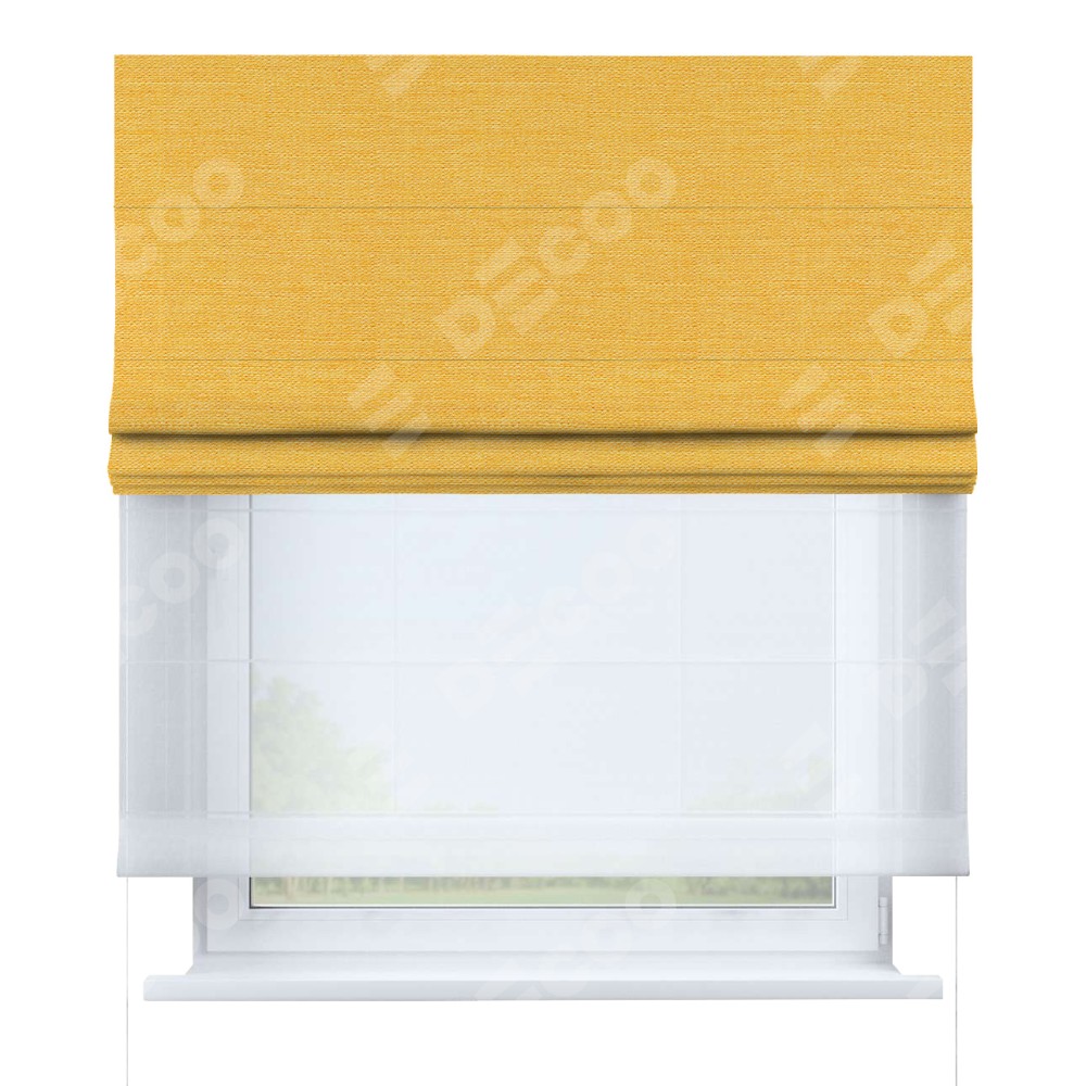 Римская штора день-ночь производителя «Cortin», используется для проёма, пошита из двух полотен, с лицевой стороны лён жёлтый артикул 63738, вторая ткань тюль (по стандарту комплектуется тюль белого цвета артикул V-01). Имеет универсальный механизм и подходит для монтажа: на потолок, на стену и в нишу.