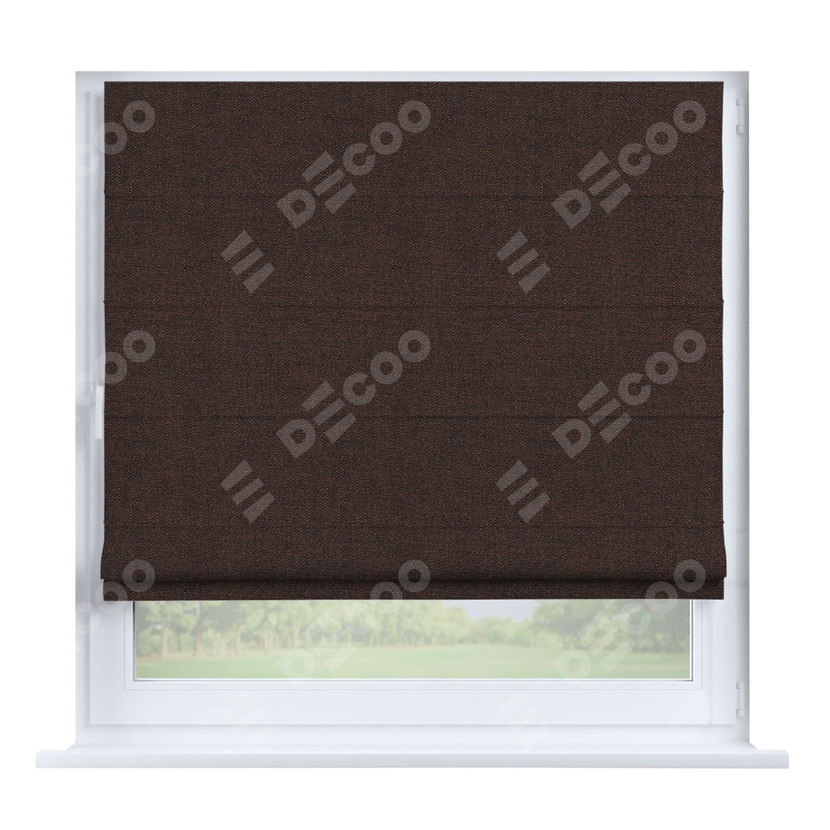 Римская штора производителя «Cortin», устанавливается на створку окна, пошита из ткани лён коричневый, артикул 53443. Штора шьётся по индивидуальным размерам, для данного типа римской шторы возможная ширина от 35 до 150 см., высота до 250 см.