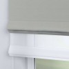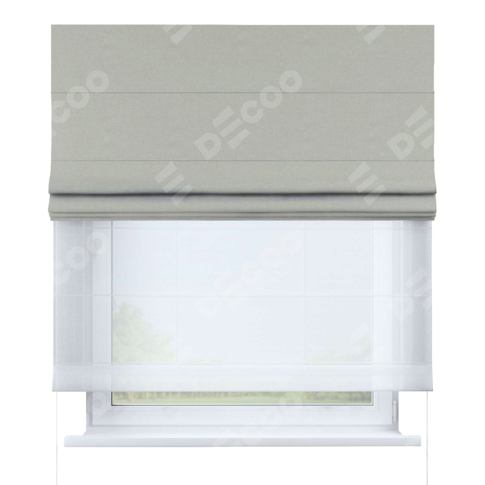 Римская штора день-ночь производителя «Cortin», используется для проёма, пошита из двух полотен, с лицевой стороны лён димаут светло-серый артикул 83025, вторая ткань тюль (по стандарту комплектуется тюль белого цвета артикул V-01). Имеет универсальный механизм и подходит для монтажа: на потолок, на стену и в нишу.