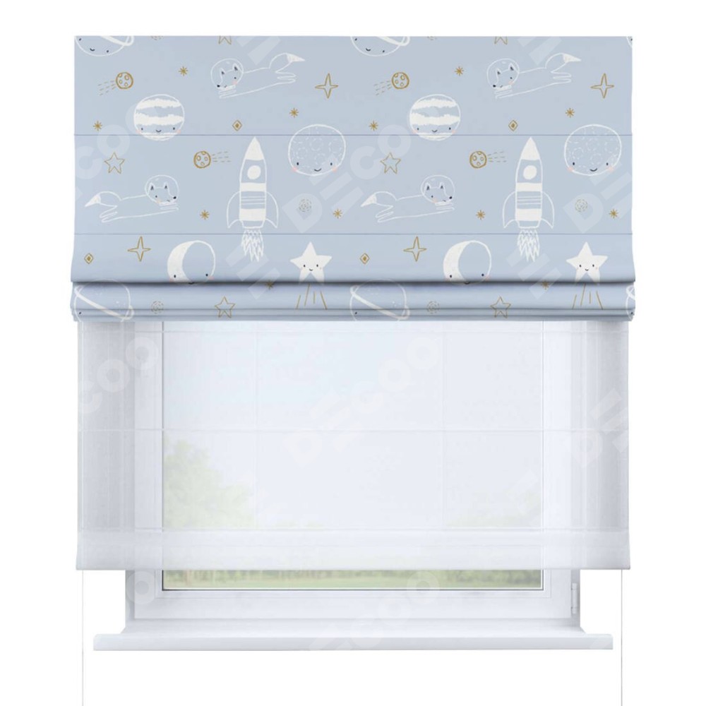 Римская штора день-ночь производителя «Cortin», используется для проёма, пошита из двух полотен, с лицевой блэкаут с нанесением сублимационной печати «Прекрасная вселенная», вторая ткань тюль (по стандарту комплектуется тюль белого цвета артикул V-01). Имеет универсальный механизм и подходит для монтажа: на потолок, на стену и в нишу.