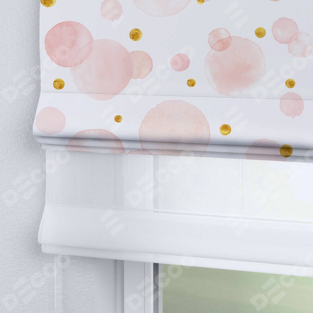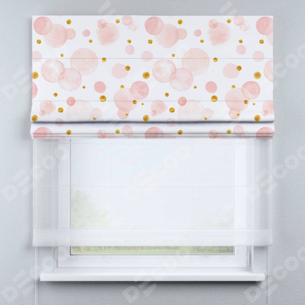 Римская штора день-ночь производителя «Cortin», используется для проёма, пошита из двух полотен, с лицевой блэкаут с нанесением сублимационной печати «Круги и точки», вторая ткань тюль (по стандарту комплектуется тюль белого цвета артикул V-01). Имеет универсальный механизм и подходит для монтажа: на потолок, на стену и в нишу.