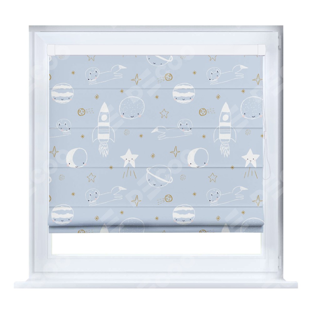 Римская штора кассетного типа, производителя «Cortin», устанавливается только на пластиковые окна и прилегает к стеклопакету, пошита из ткани блэкаут с нанесением сублимационной печати «Прекрасная вселенная».