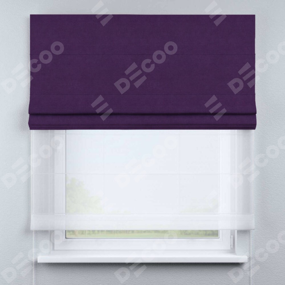 Римская штора день-ночь производителя «Cortin», используется для проёма, пошита из двух полотен, с лицевой стороны вельвет тёмно-фиолетовый артикул 17753, вторая ткань тюль (по стандарту комплектуется тюль белого цвета артикул V-01). Имеет универсальный механизм и подходит для монтажа: на потолок, на стену и в нишу.