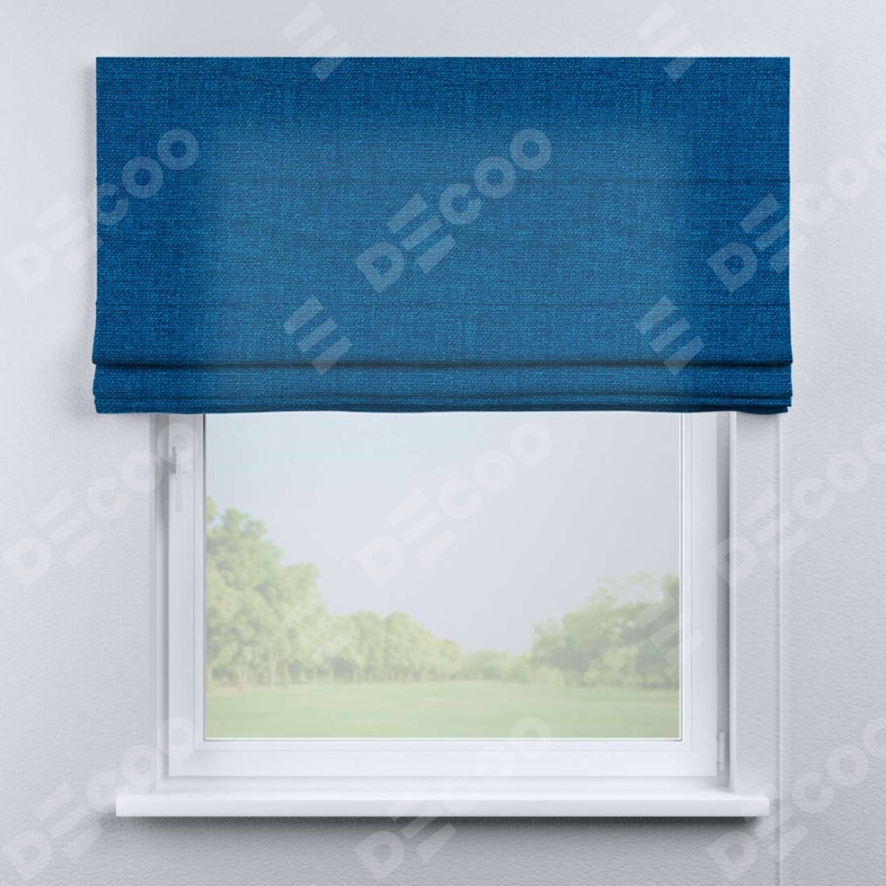 Римская штора производителя «Cortin», используется для проёма, пошита из ткани лён синий, артикул ткани 63742. Имеет универсальный механизм и подходит для монтажа: на потолок, на стену и в нишу.