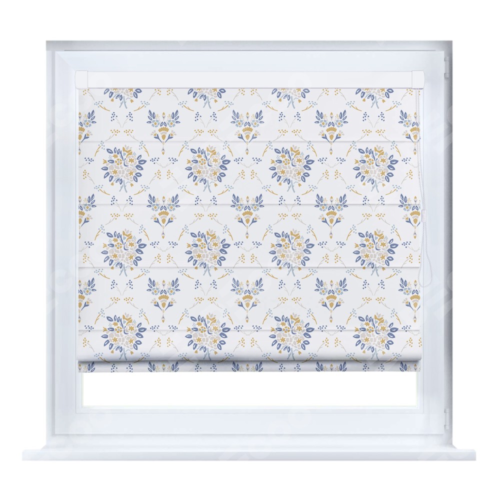 Римская штора кассетного типа, производителя «Cortin», устанавливается только на пластиковые окна и прилегает к стеклопакету, пошита из ткани блэкаут с нанесением сублимационной печати «Французский цветок».