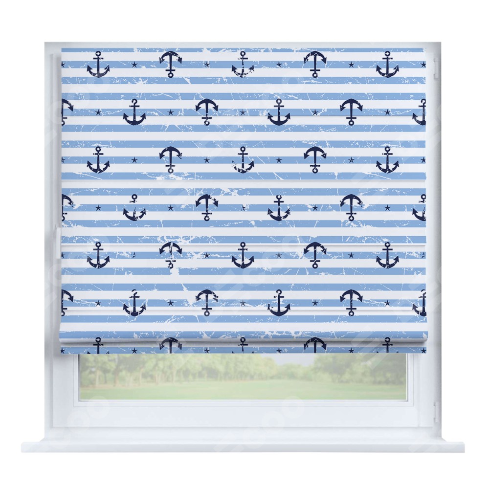 Римская штора производителя «Cortin», устанавливается на створку окна, пошита из ткани блэкаут с нанесением сублимационной печати «Полоски и якори». Штора шьётся по индивидуальным размерам, для данного типа римской шторы возможная ширина от 35 до 150 см., высота до 250 см.