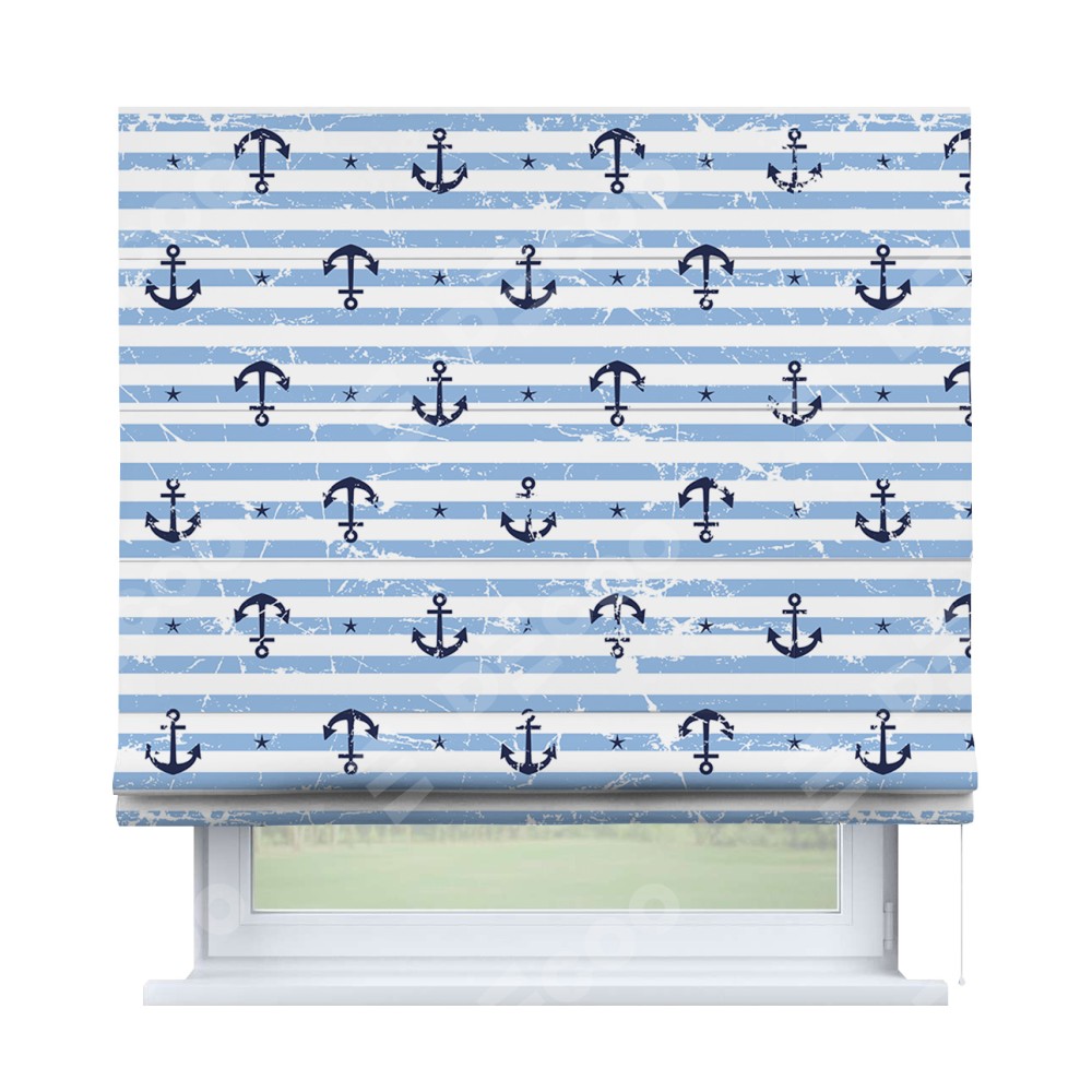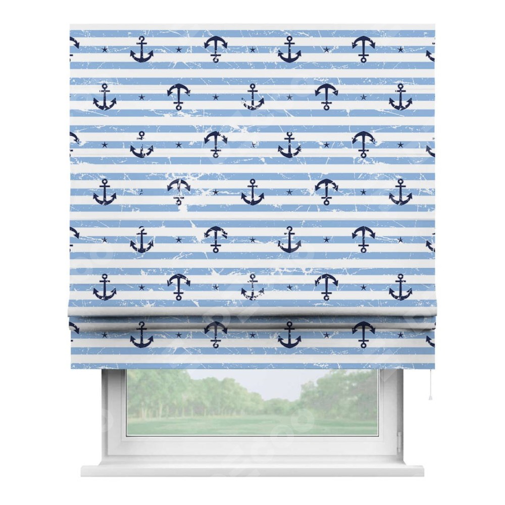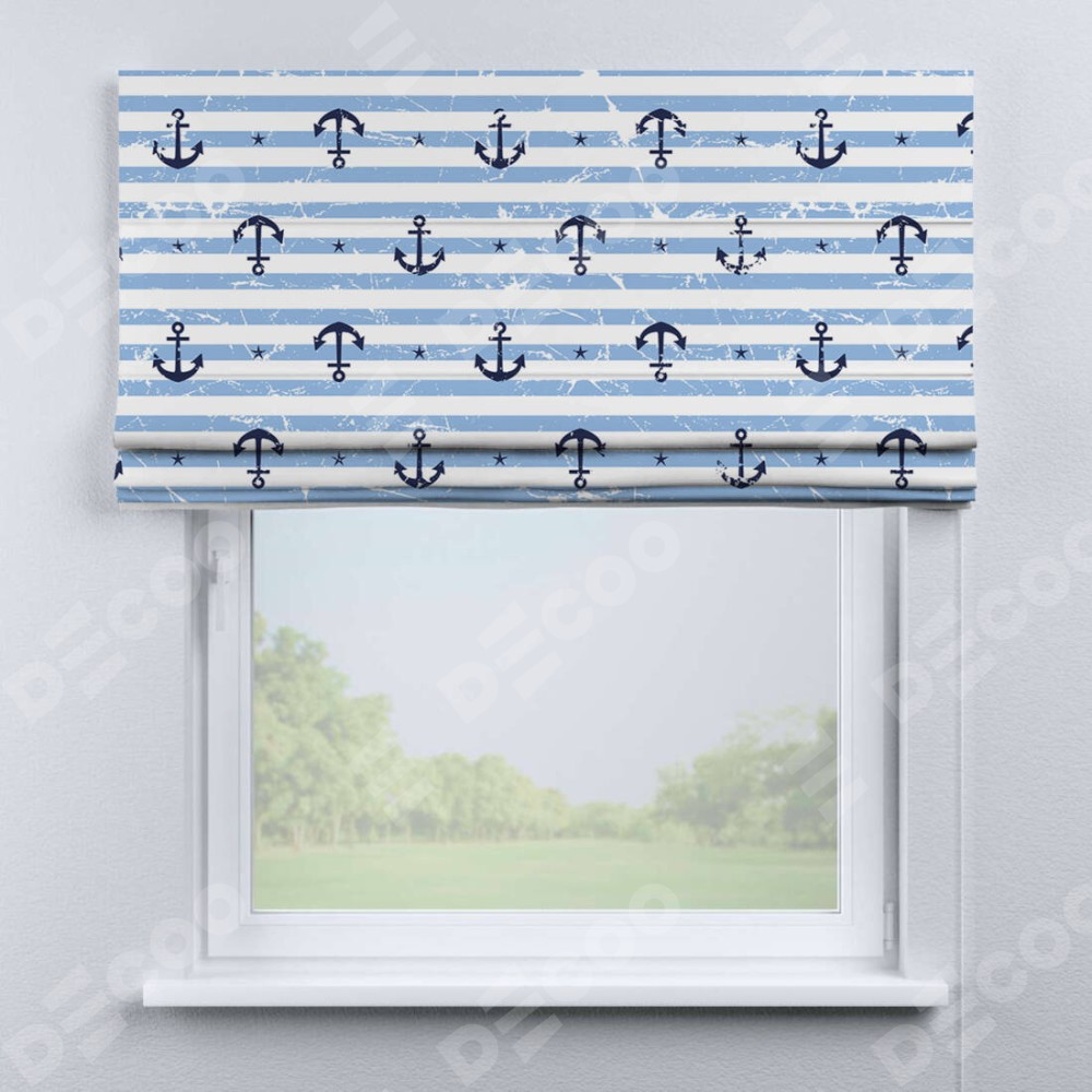 Римская штора производителя «Cortin», используется для проёма, пошита из ткани блэкаут с нанесением сублимационной печати «Полоски и якори». Имеет универсальный механизм и подходит для монтажа: на потолок, на стену и в нишу.