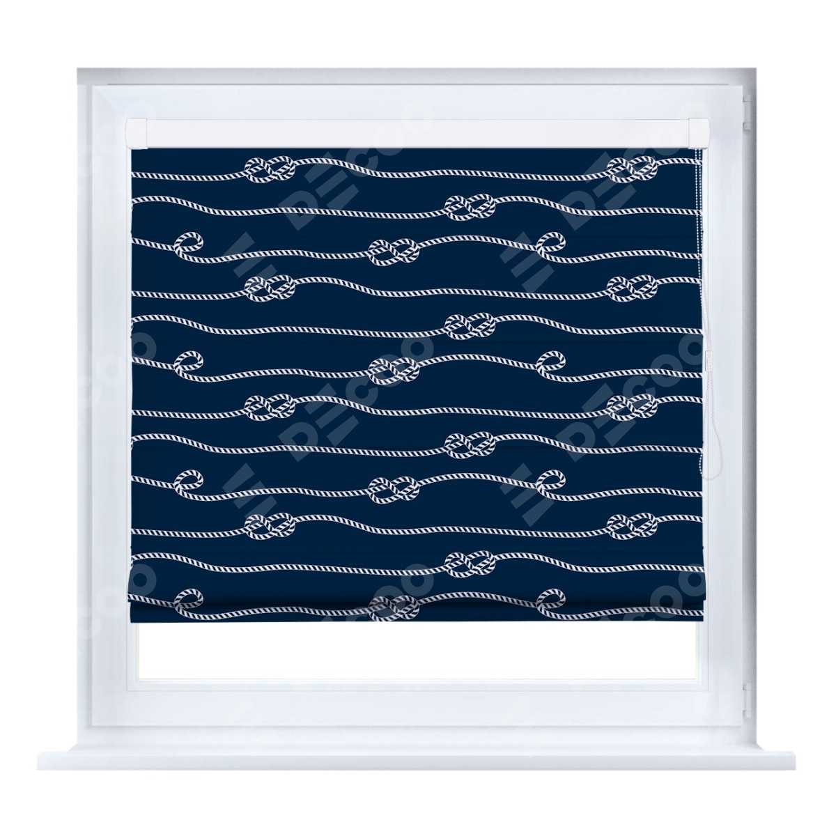 Римская штора кассетного типа, производителя «Cortin», устанавливается только на пластиковые окна и прилегает к стеклопакету, пошита из ткани блэкаут с нанесением сублимационной печати «Морской узел».