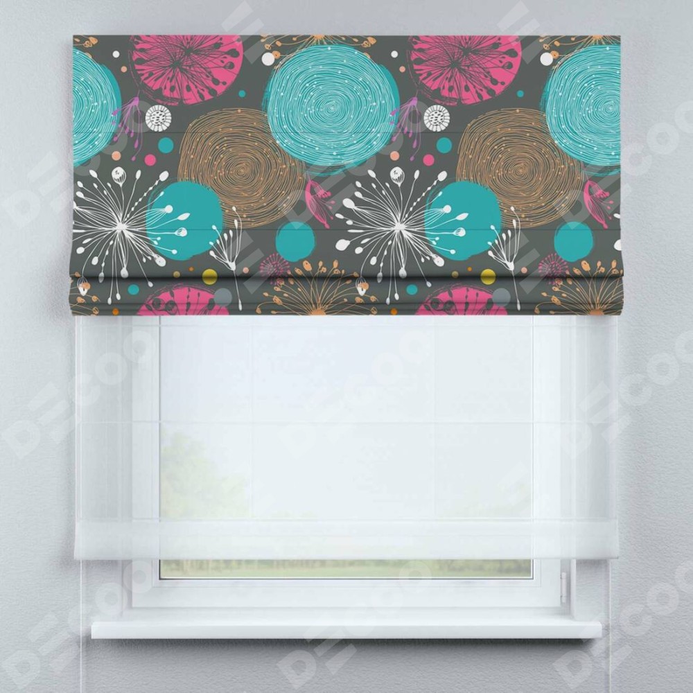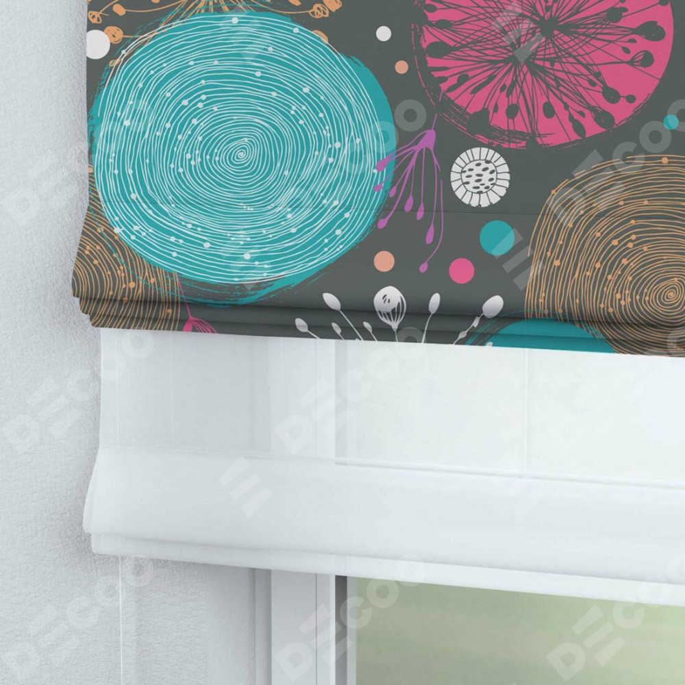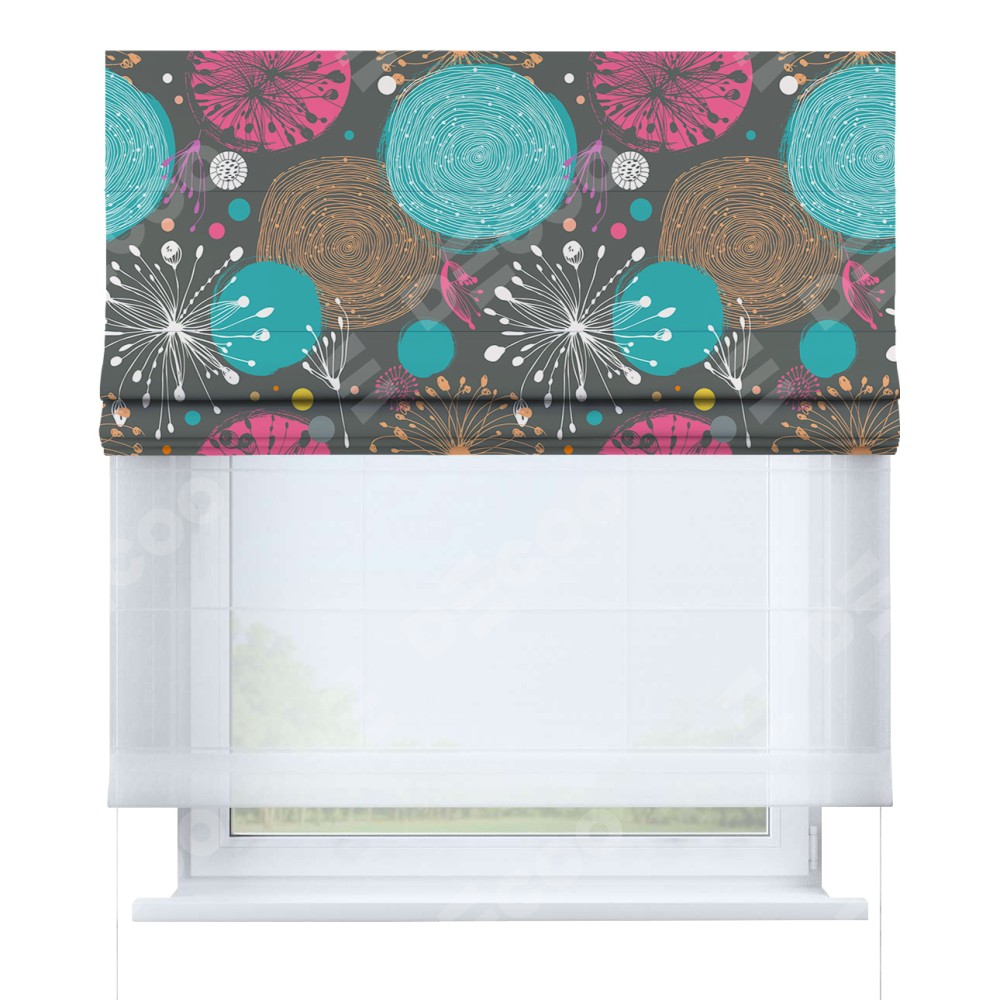 Римская штора день-ночь производителя «Cortin», используется для проёма, пошита из двух полотен, с лицевой блэкаут с нанесением сублимационной печати «Милый гранж», вторая ткань тюль (по стандарту комплектуется тюль белого цвета артикул V-01). Имеет универсальный механизм и подходит для монтажа: на потолок, на стену и в нишу.
