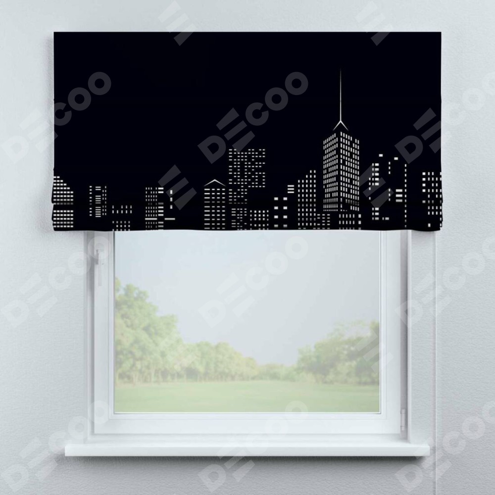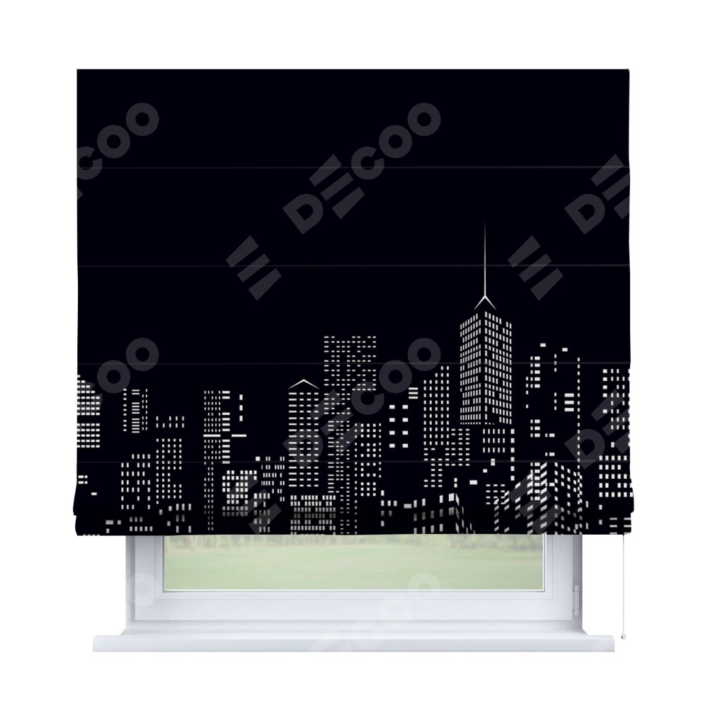 Римская штора производителя «Cortin», используется для проёма, пошита из ткани блэкаут с нанесением сублимационной печати «Ночной город». Имеет универсальный механизм и подходит для монтажа: на потолок, на стену и в нишу.