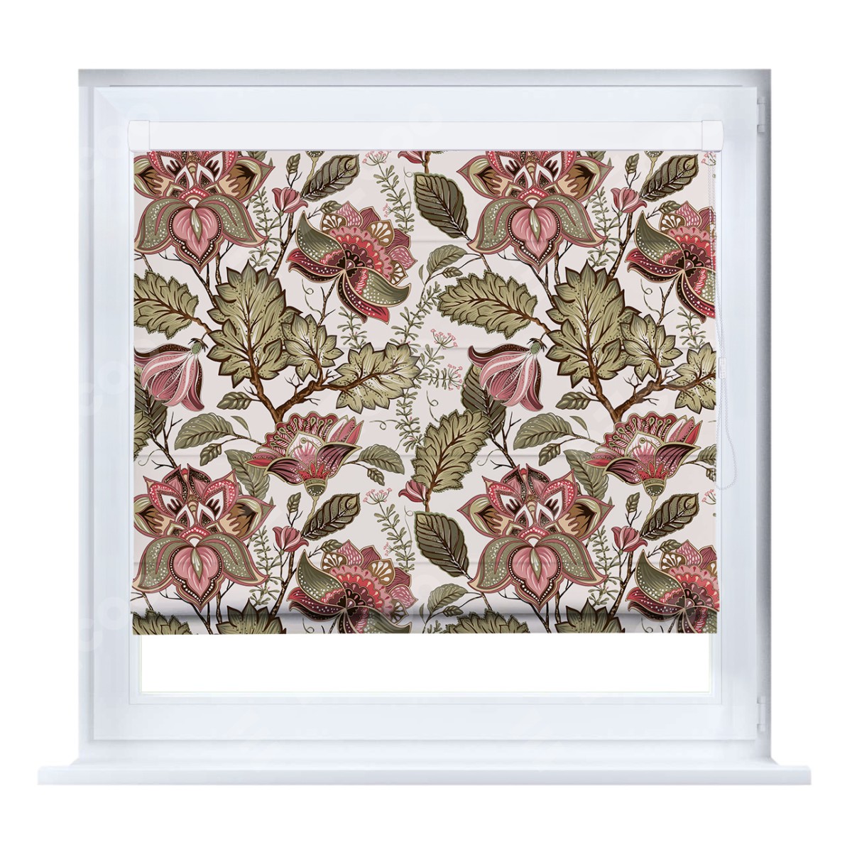 Римская штора кассетного типа, производителя «Cortin», устанавливается только на пластиковые окна и прилегает к стеклопакету, пошита из ткани блэкаут с нанесением сублимационной печати «Старинные цветы».
