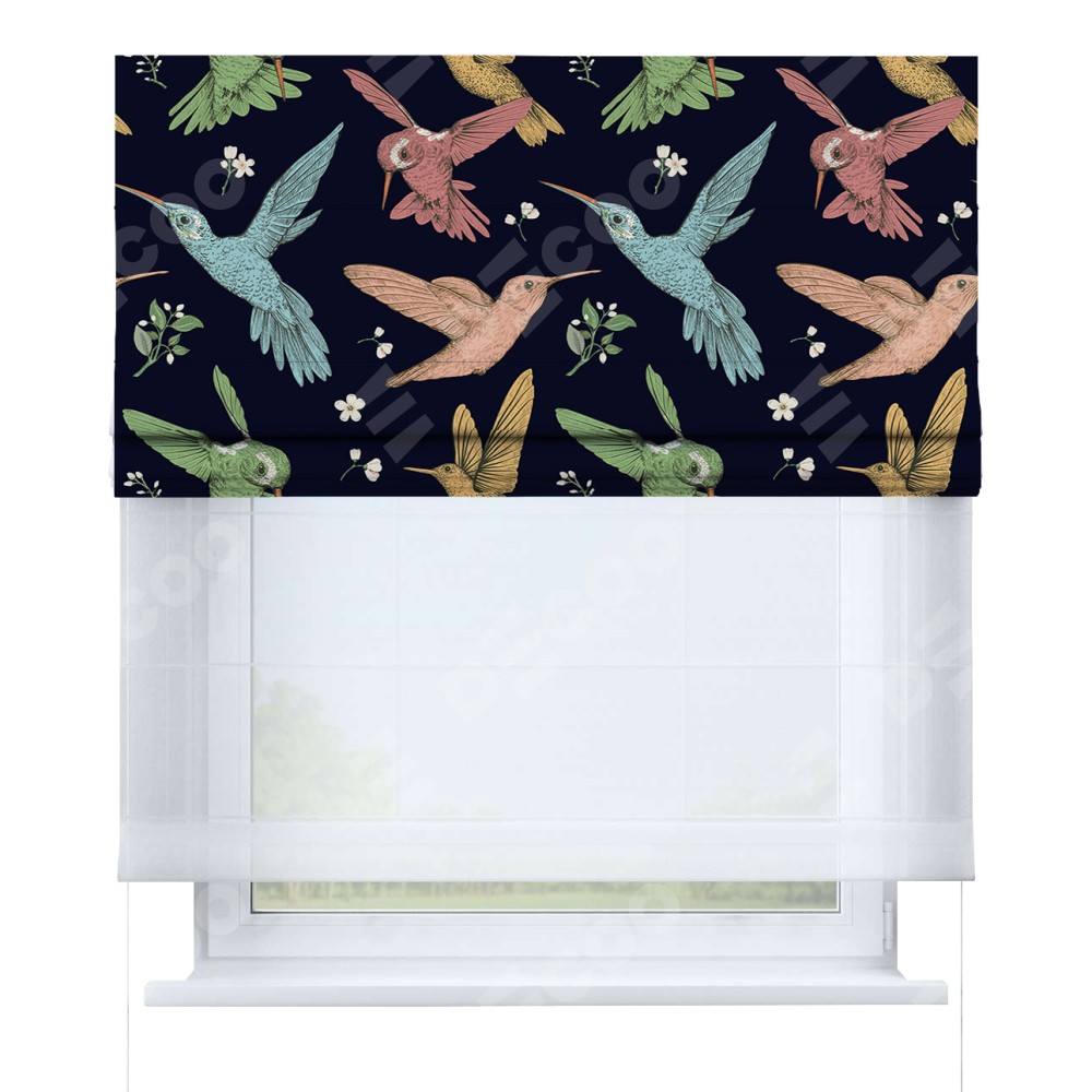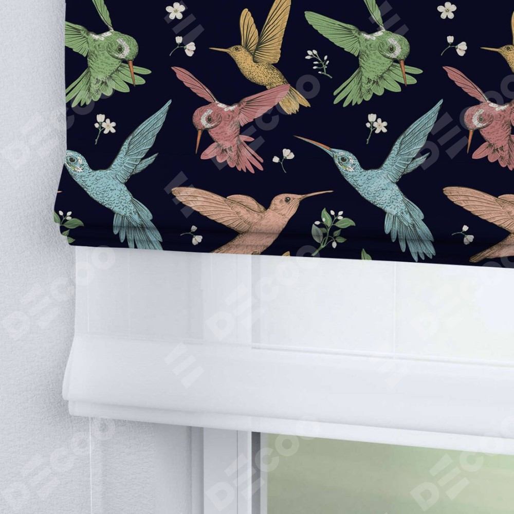 Римская штора день-ночь производителя «Cortin», используется для проёма, пошита из двух полотен, с лицевой блэкаут с нанесением сублимационной печати «Птицы и цветы», вторая ткань тюль (по стандарту комплектуется тюль белого цвета артикул V-01). Имеет универсальный механизм и подходит для монтажа: на потолок, на стену и в нишу.