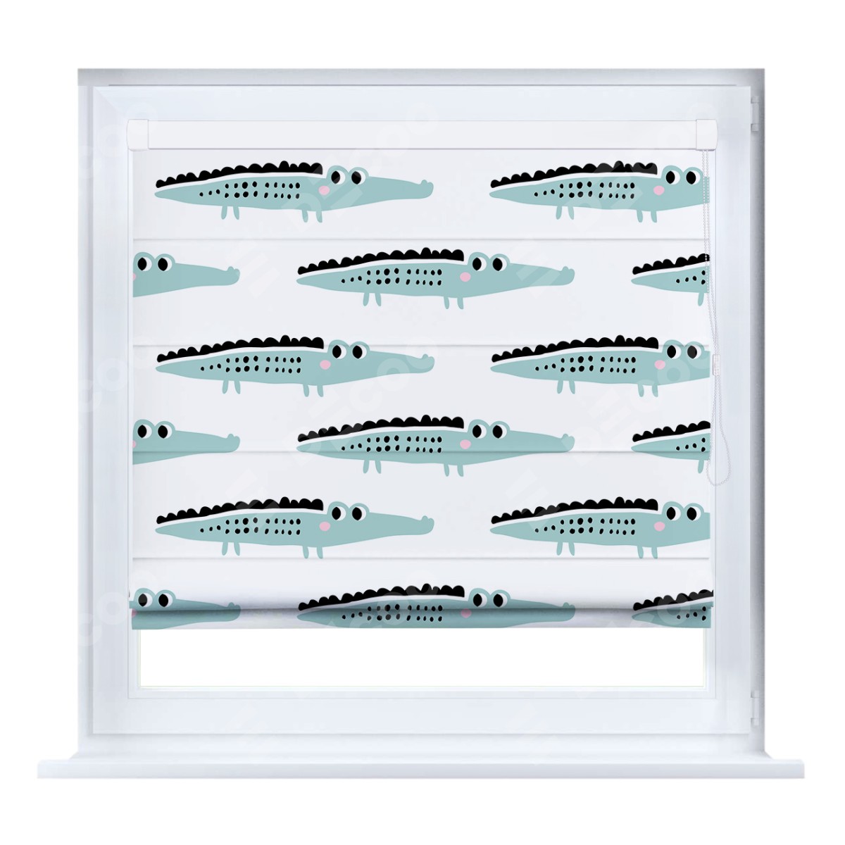 Римская штора кассетного типа, производителя «Cortin», устанавливается только на пластиковые окна и прилегает к стеклопакету, пошита из ткани блэкаут с нанесением сублимационной печати «Мистер Крок».