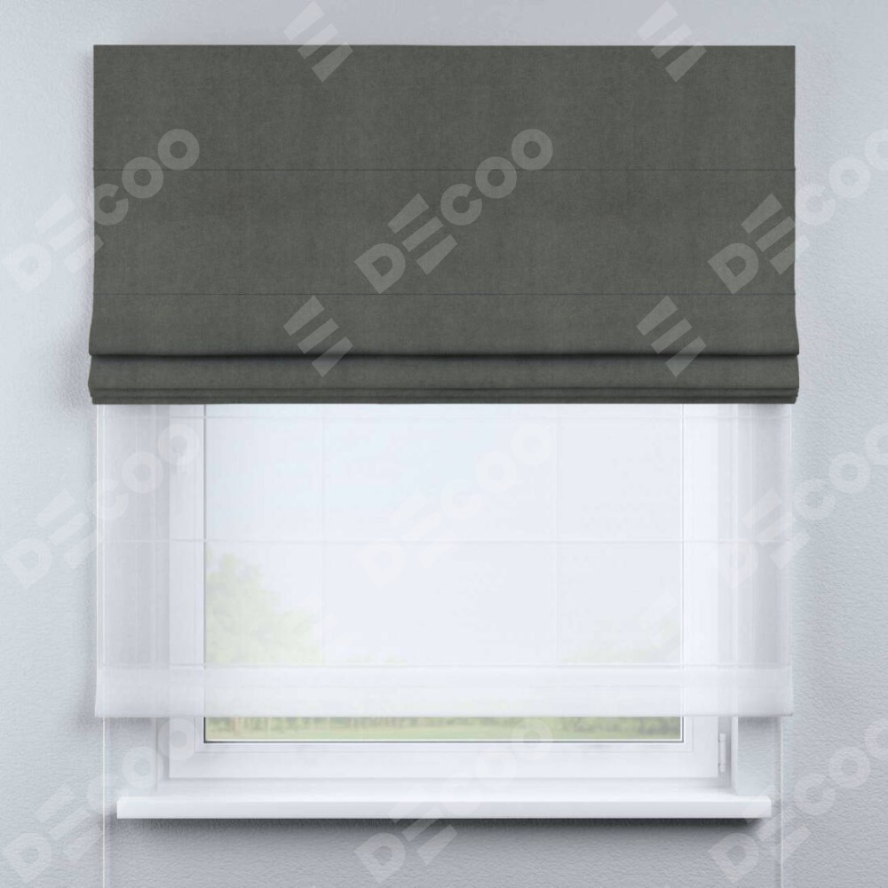 Римская штора день-ночь производителя «Cortin», используется для проёма, пошита из двух полотен, с лицевой стороны вельвет тёмно-серый артикул 85542, вторая ткань тюль (по стандарту комплектуется тюль белого цвета артикул V-01). Имеет универсальный механизм и подходит для монтажа: на потолок, на стену и в нишу.