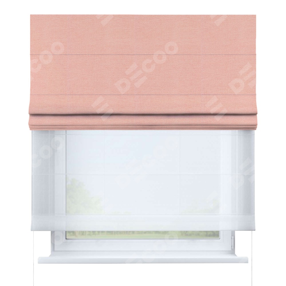 Римская штора день-ночь производителя «Cortin», используется для проёма, пошита из двух полотен, с лицевой стороны лён розовый артикул 00005, вторая ткань тюль (по стандарту комплектуется тюль белого цвета артикул V-01). Имеет универсальный механизм и подходит для монтажа: на потолок, на стену и в нишу.