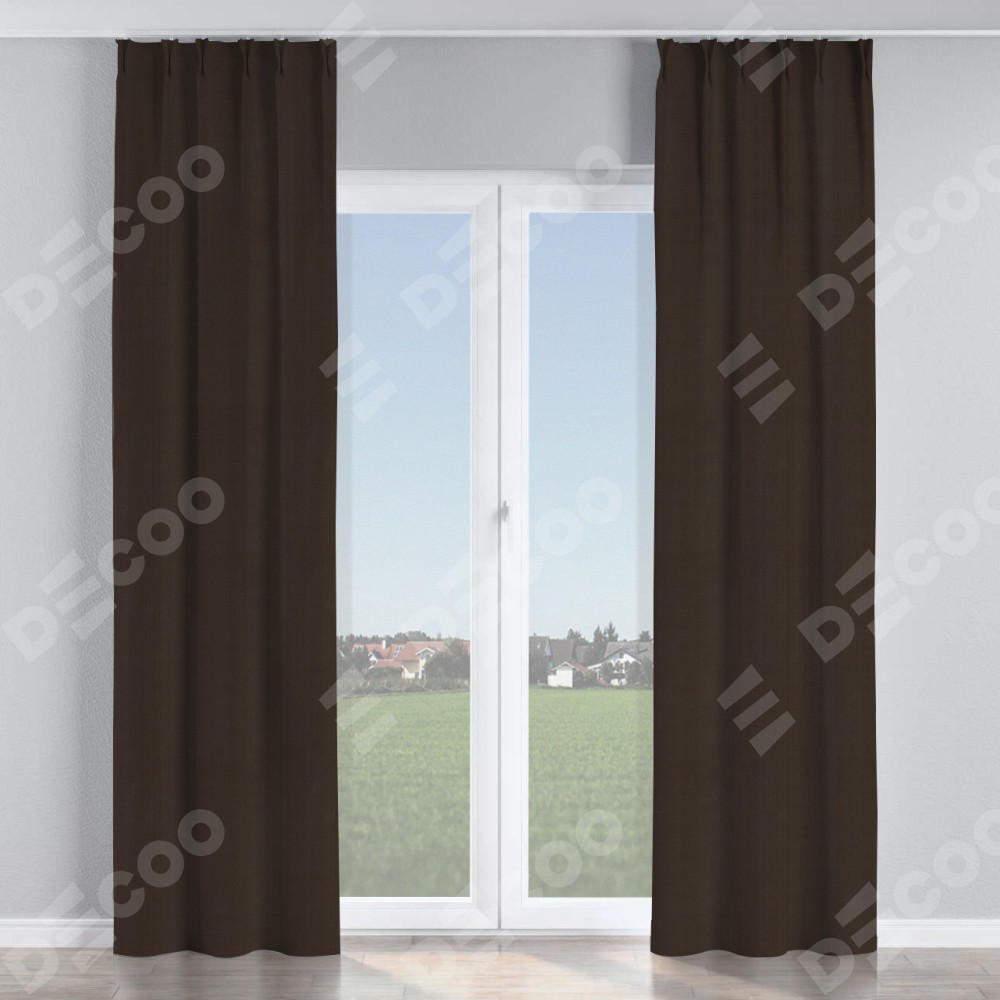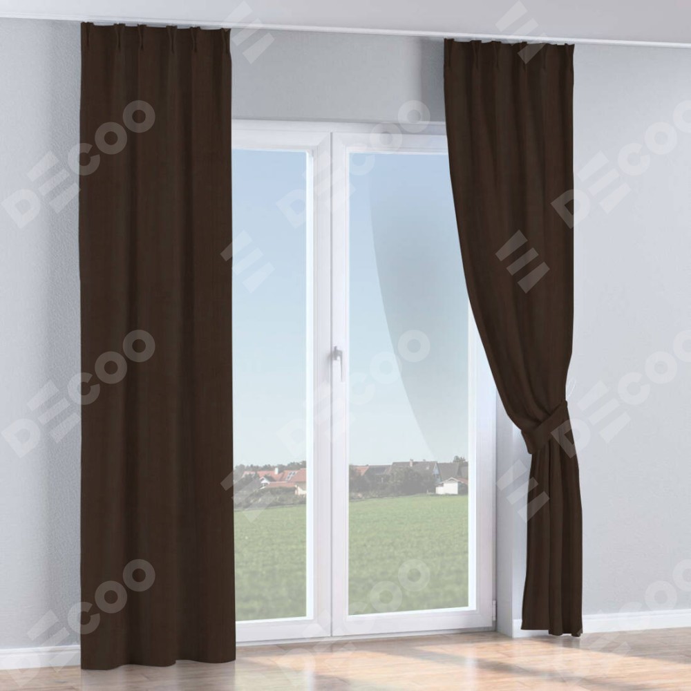 Комплект прямых штор, от производителя «Cortin», пошиты из ткани блэкаут однотонный венге, артикул ткани 88286. С изнаночной стороны в верхней части штор пристрачивается шторная лента с декоративными складками «Кустик». Для создания элегантных складок прямые шторы шьются по стандарту с коэффициентом 1:2 (на 100 см. ширины проёма 200 см. ширины ткани).