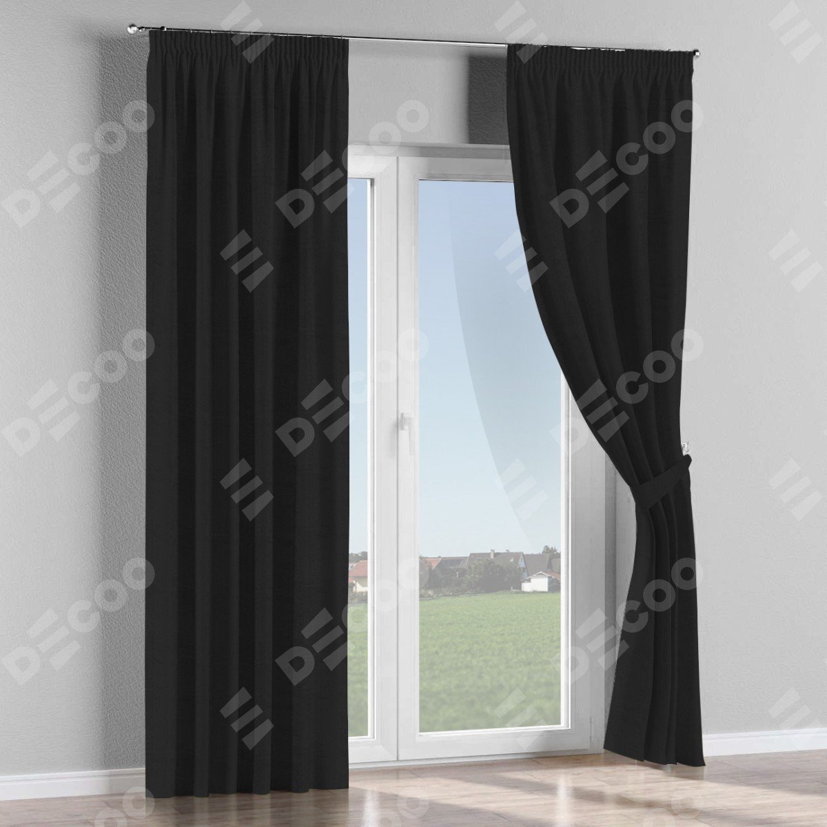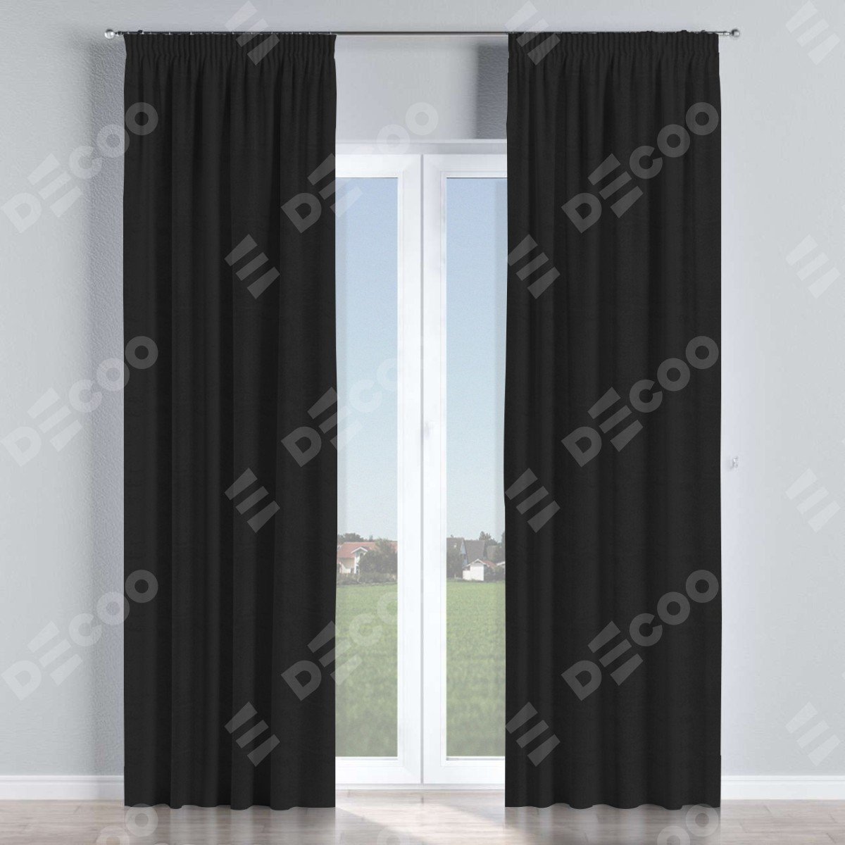 Комплект прямых штор, от производителя «Cortin», пошиты из ткани блэкаут однотонный черный, артикул ткани 79904. С изнаночной стороны в верхней части штор пристрачивается шторная лента с декоративными складками «Карандаш». Для создания элегантных складок прямые шторы шьются по стандарту с коэффициентом 1:2 (на 100 см. ширины проёма 200 см. ширины ткани).