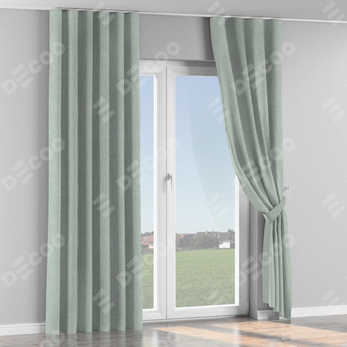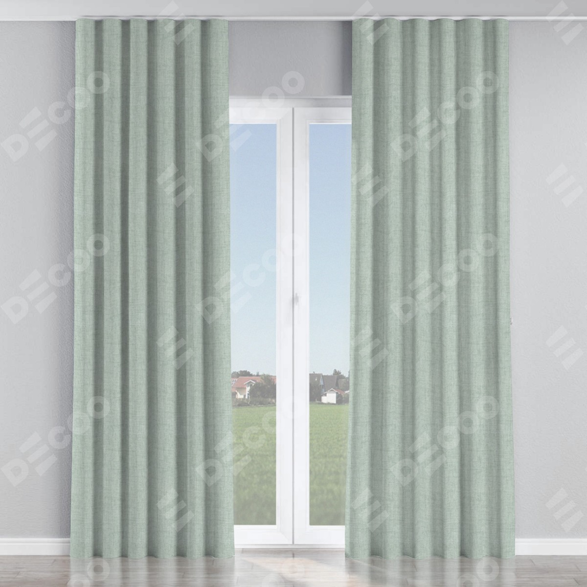 Комплект прямых штор, от производителя «Cortin», пошиты из ткани рогожка димаут серый, артикул ткани 80426. С изнаночной стороны в верхней части штор пристрачивается шторная лента с декоративными складками «Волна». Для создания элегантных складок прямые шторы шьются по стандарту с коэффициентом 1:2 (на 100 см. ширины проёма 200 см. ширины ткани).