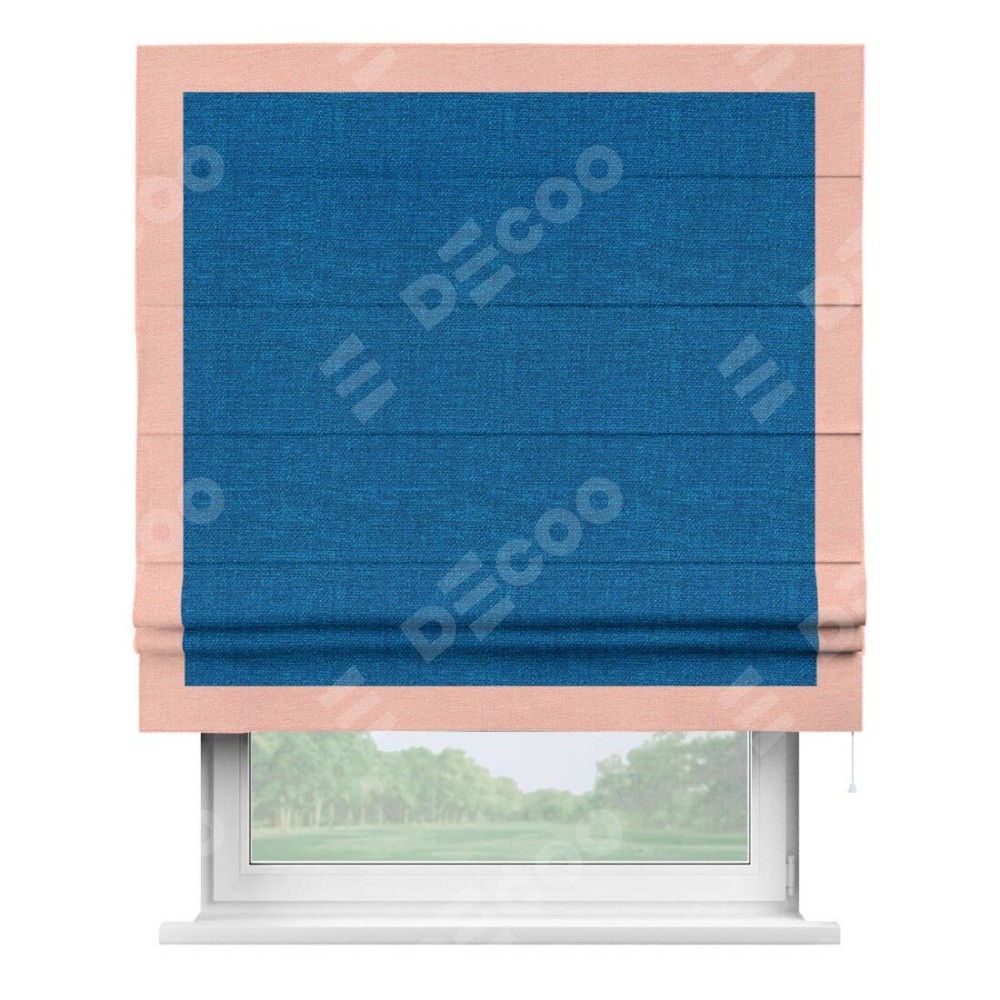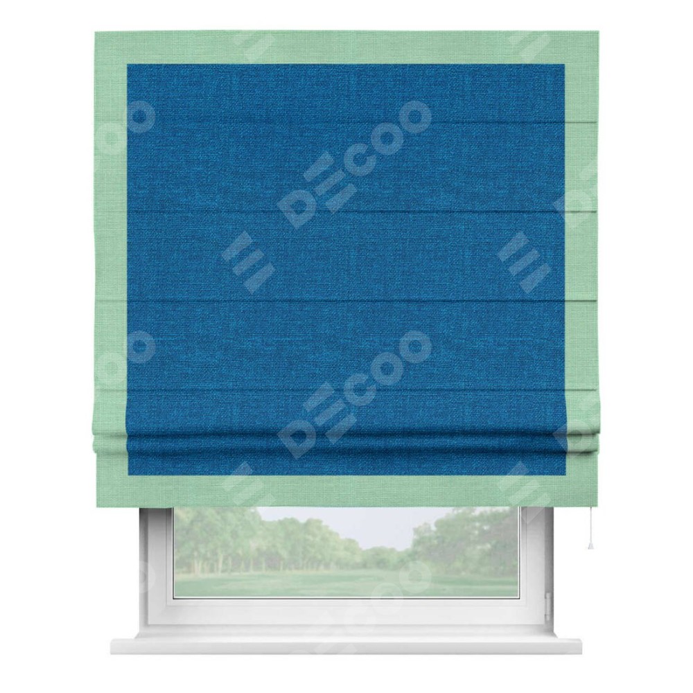Римская штора производителя «Cortin», используется для проёма, пошита из ткани лён синий, артикул 63742. Отделка шторы кантом «Чесс», ткань для канта используется из льна разной расцветки на выбор. Имеет универсальный механизм и подходит для монтажа: на потолок, на стену и в нишу.
