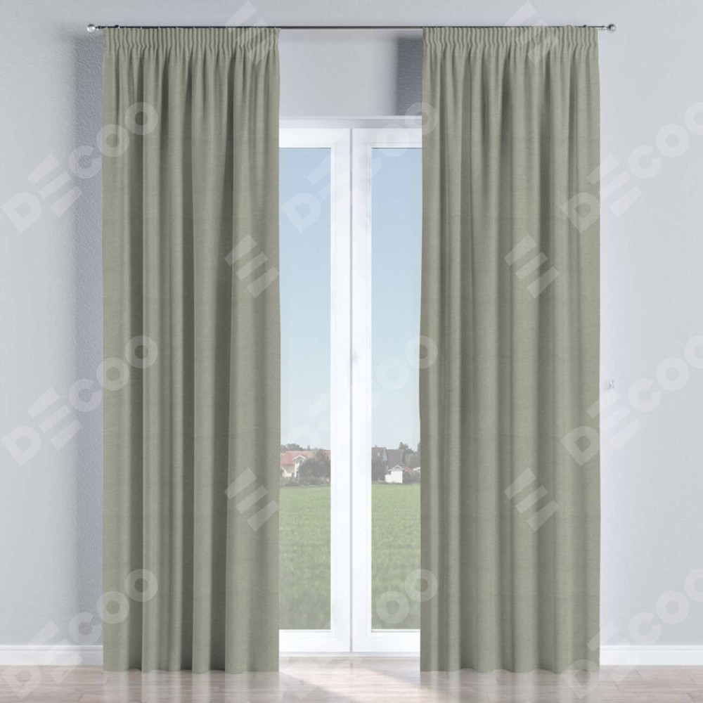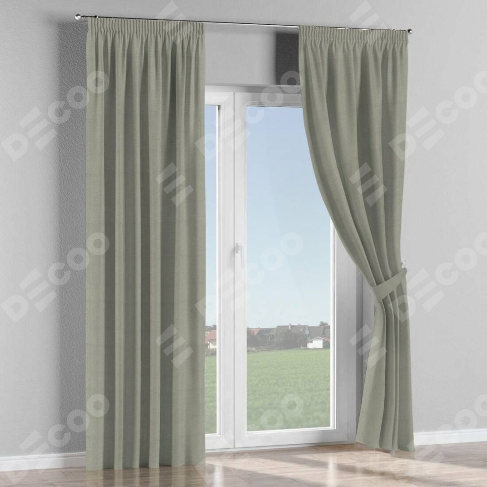 Комплект прямых штор, от производителя «Cortin», пошиты из ткани лён димаут серый, артикул ткани 00001. С изнаночной стороны в верхней части штор пристрачивается шторная лента с декоративными складками «Карандаш». Для создания элегантных складок прямые шторы шьются по стандарту с коэффициентом 1:2 (на 100 см. ширины проёма 200 см. ширины ткани).