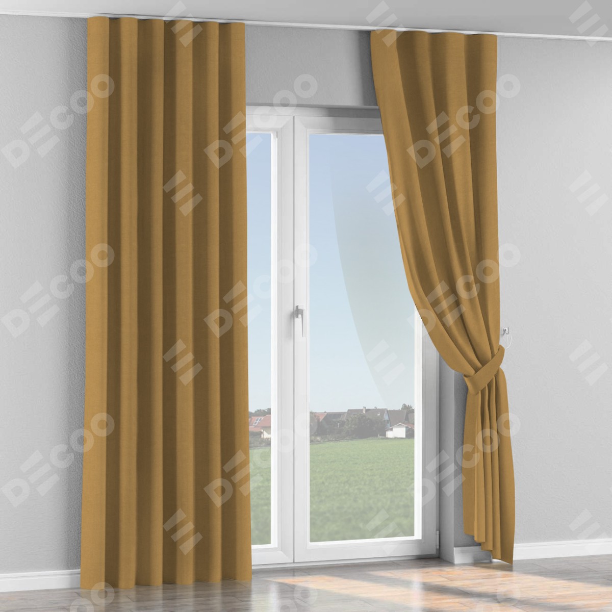 Комплект прямых штор, от производителя «Cortin», пошиты из ткани вельвет горчица, артикул ткани 17760. С изнаночной стороны в верхней части штор пристрачивается шторная лента с декоративными складками «Волна». Для создания элегантных складок прямые шторы шьются по стандарту с коэффициентом 1:2 (на 100 см. ширины проёма 200 см. ширины ткани).