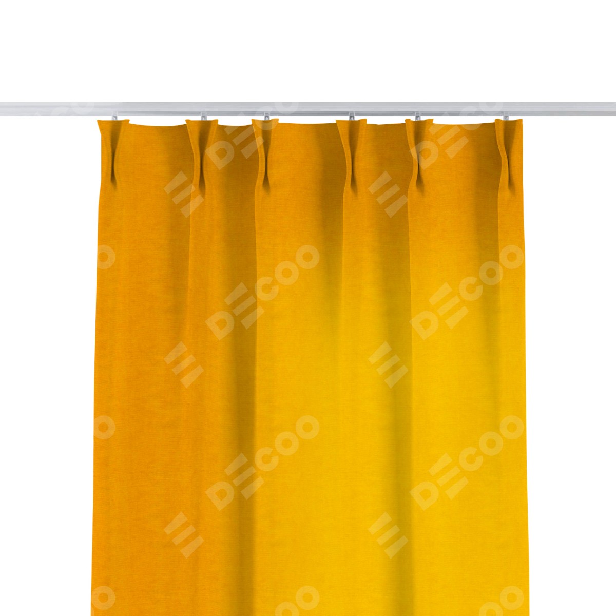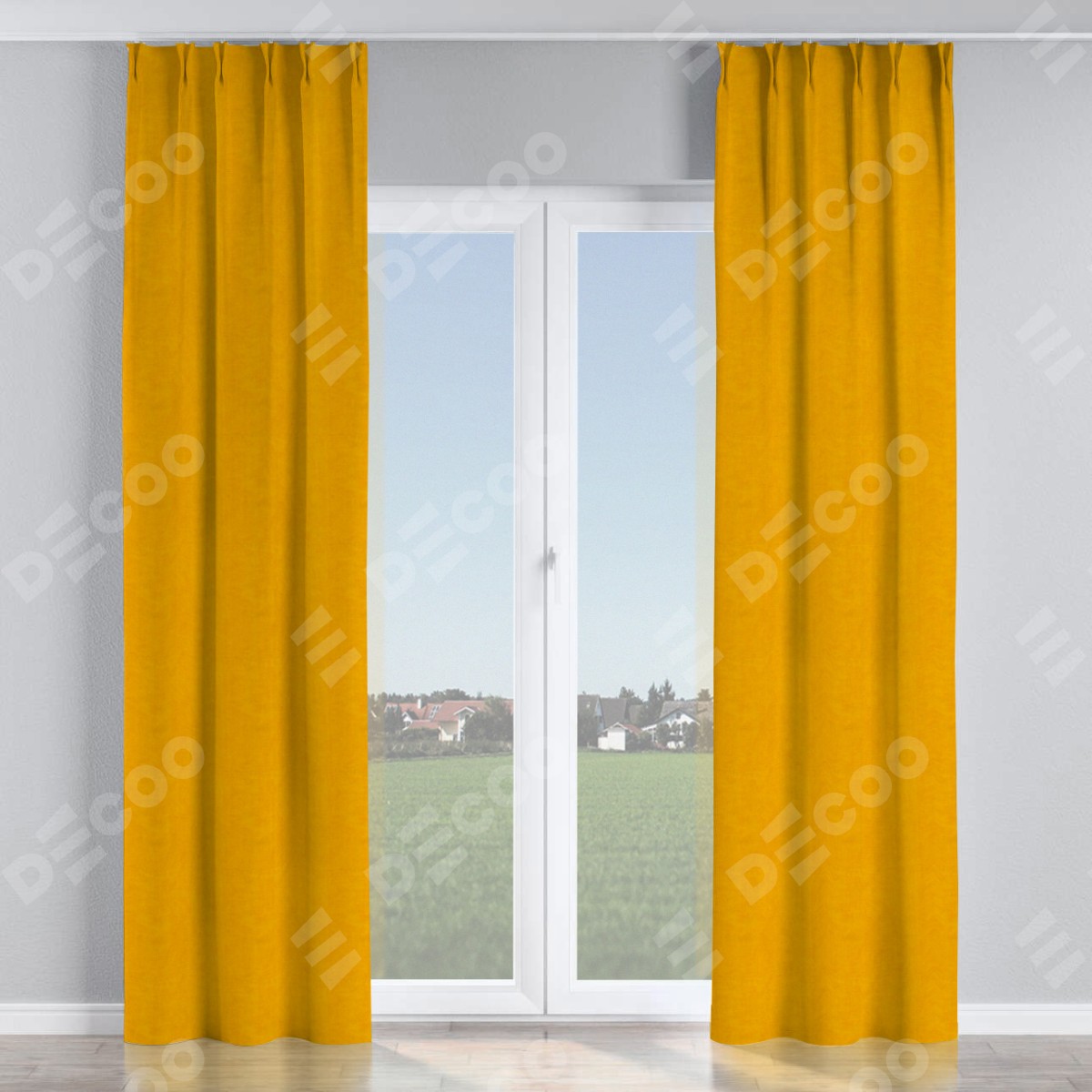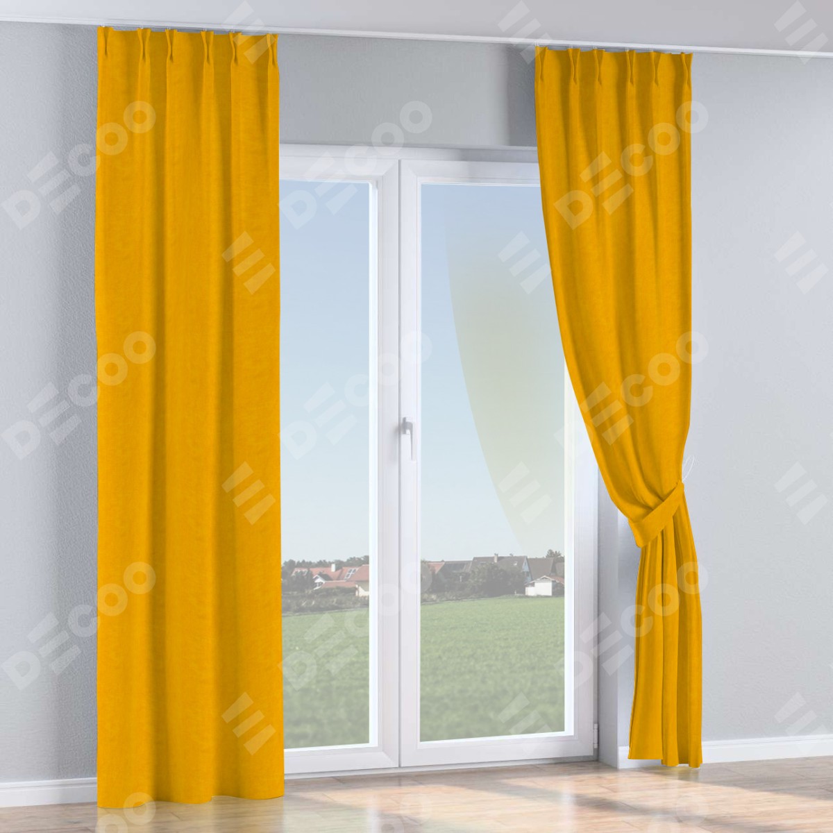 Комплект прямых штор, от производителя «Cortin», пошиты из ткани вельвет желтый, артикул ткани 85547. С изнаночной стороны в верхней части штор пристрачивается шторная лента с декоративными складками «Кустик». Для создания элегантных складок прямые шторы шьются по стандарту с коэффициентом 1:2 (на 100 см. ширины проёма 200 см. ширины ткани).