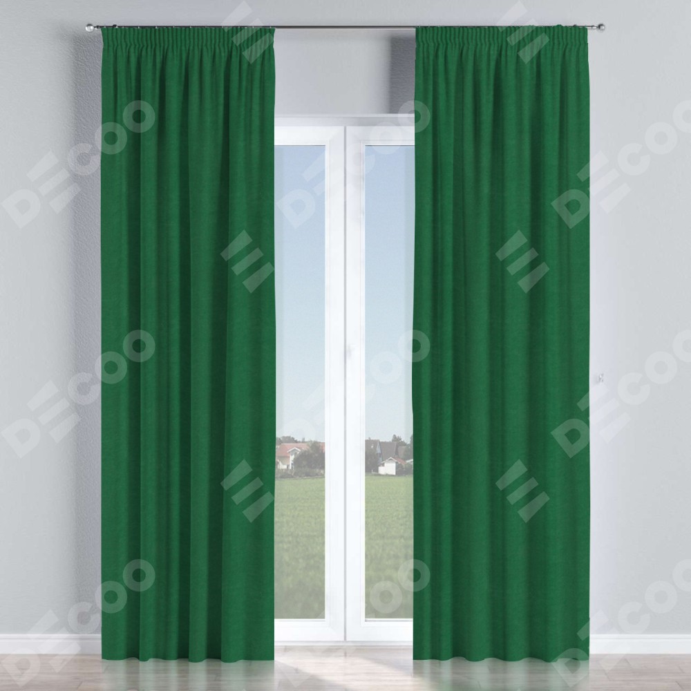 Комплект прямых штор, от производителя «Cortin», пошиты из ткани вельвет зелёный, артикул ткани 85546. С изнаночной стороны в верхней части штор пристрачивается шторная лента с декоративными складками «Карандаш». Для создания элегантных складок прямые шторы шьются по стандарту с коэффициентом 1:2 (на 100 см. ширины проёма 200 см. ширины ткани).