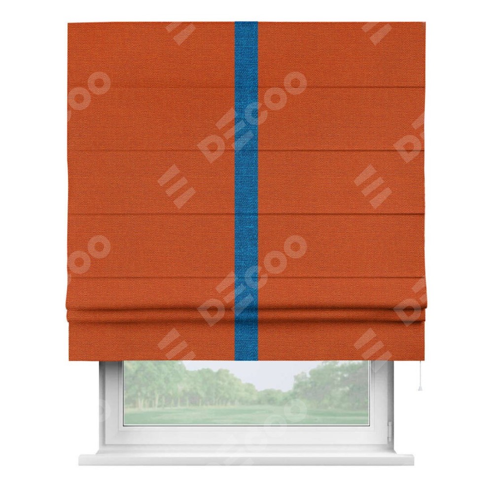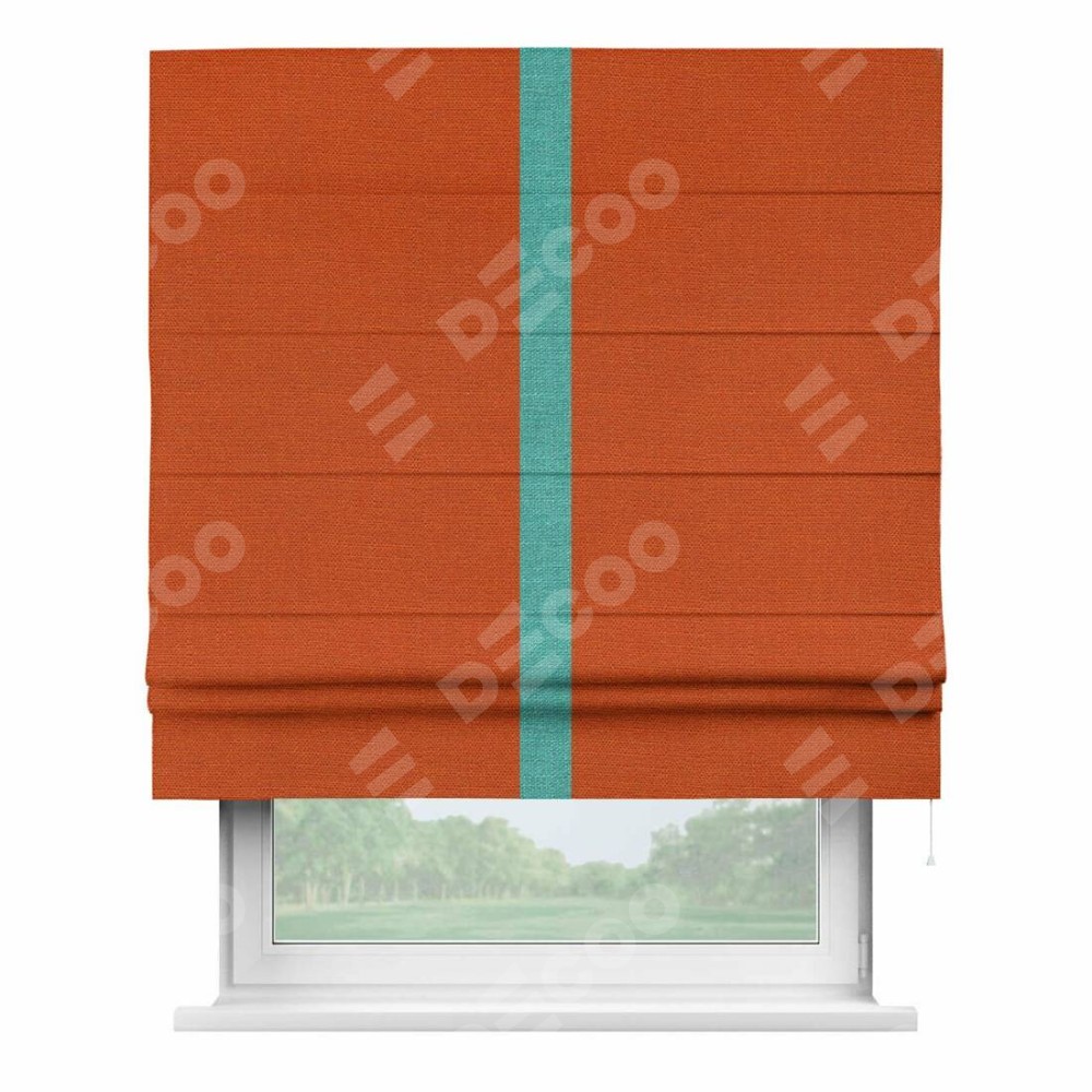 Римская штора производителя «Cortin», используется для проёма, пошита из ткани лён терракотовый, артикул 53440. Отделка шторы кантом «Хайвэй», ткань для канта используется из льна разной расцветки на выбор. Имеет универсальный механизм и подходит для монтажа: на потолок, на стену и в нишу.