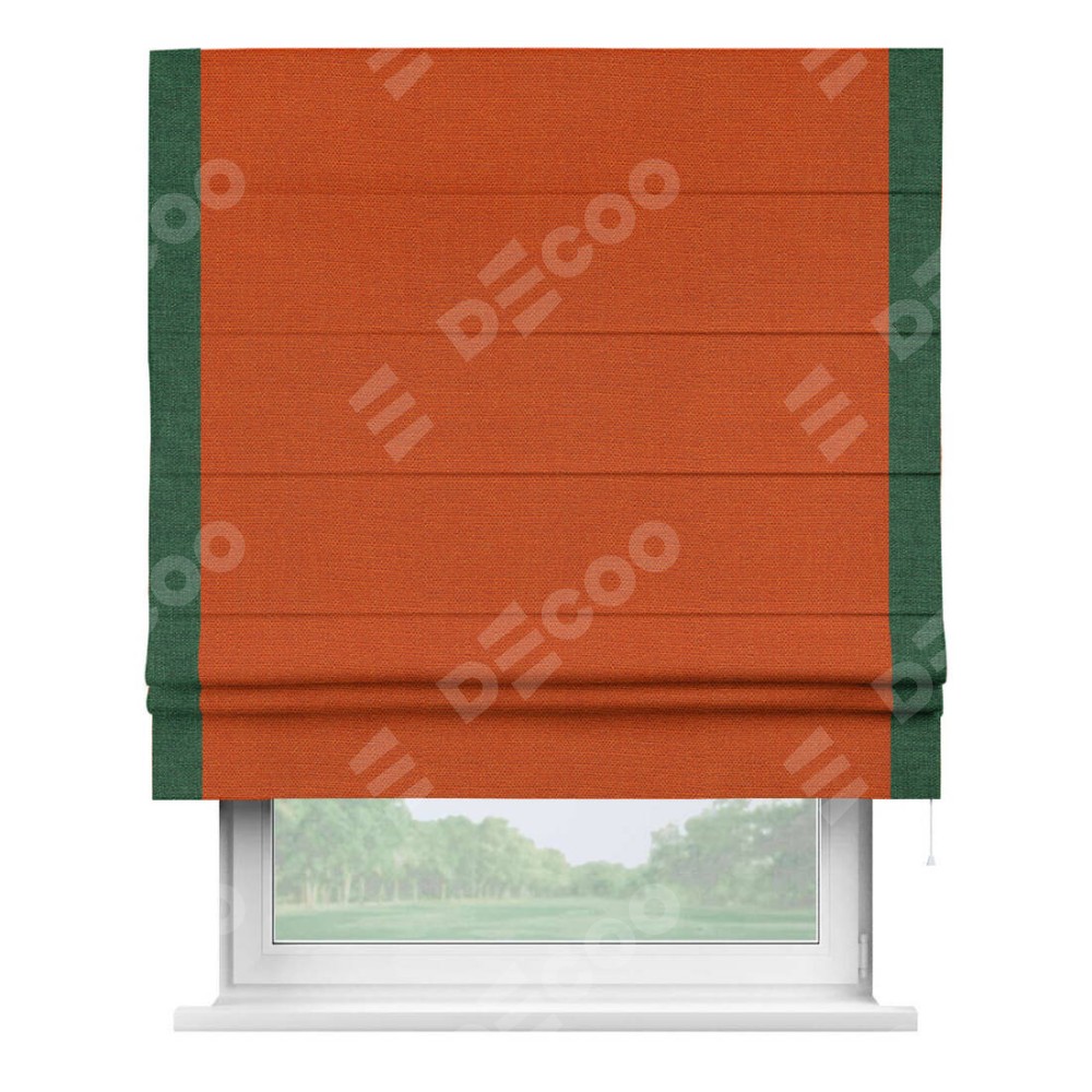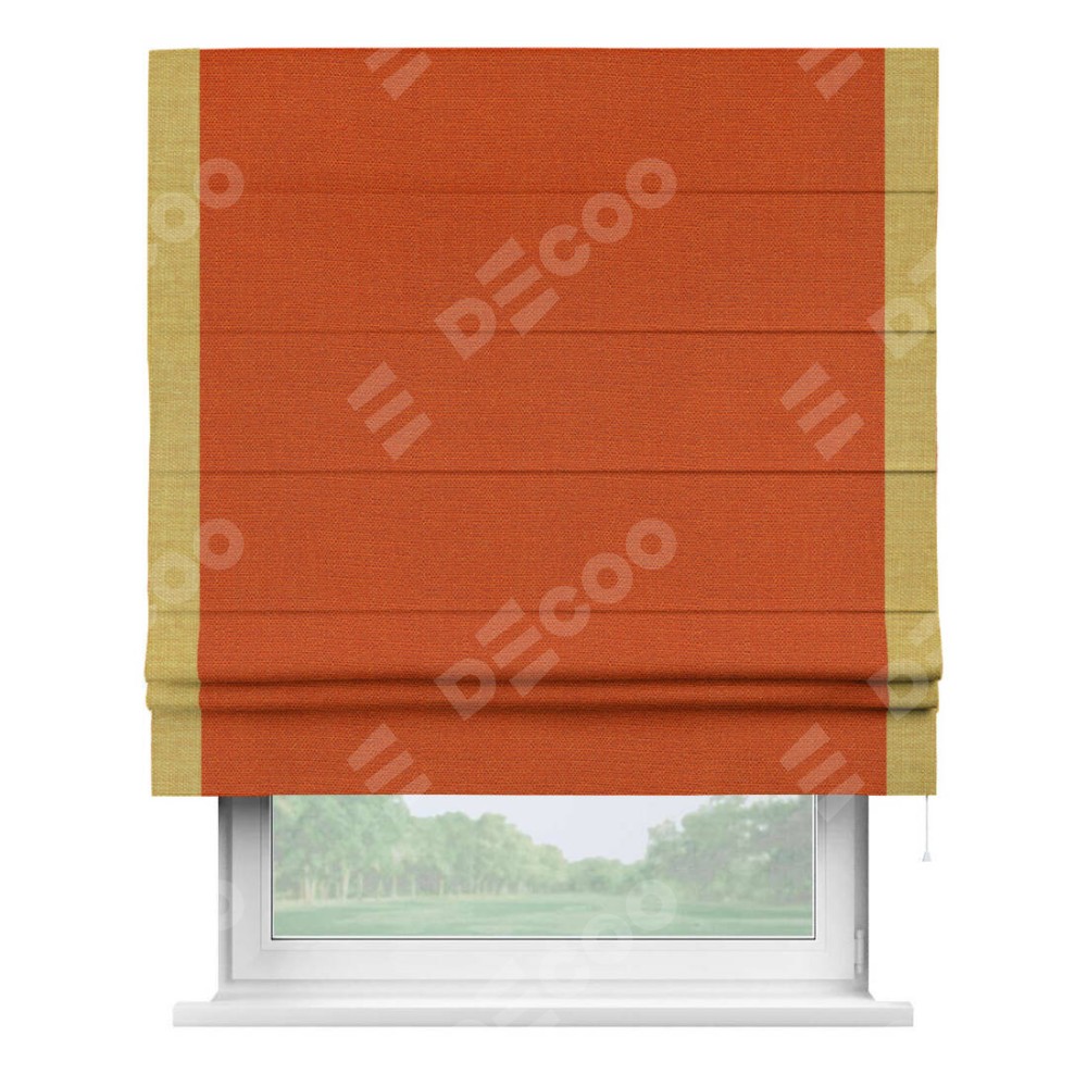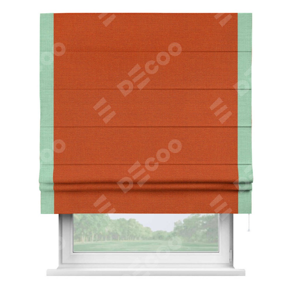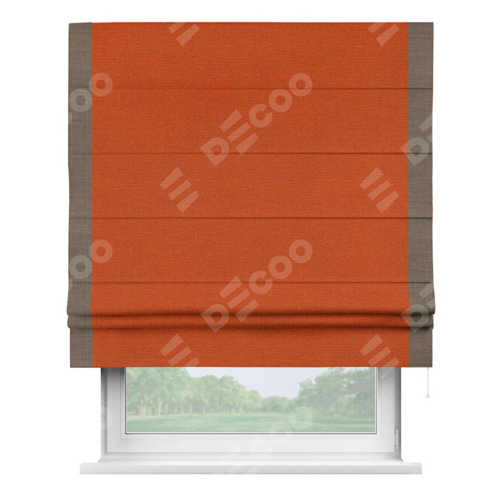 Римская штора производителя «Cortin», используется для проёма, пошита из ткани лён терракотовый, артикул 53440. Отделка шторы кантом «Стрим Дуо», ткань для канта используется из льна разной расцветки на выбор. Имеет универсальный механизм и подходит для монтажа: на потолок, на стену и в нишу.