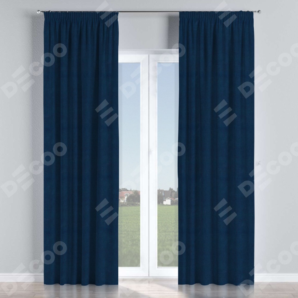 Комплект прямых штор, от производителя «Cortin», пошиты из ткани вельвет тёмно-синий, артикул ткани 14152. С изнаночной стороны в верхней части штор пристрачивается шторная лента с декоративными складками «Карандаш». Для создания элегантных складок прямые шторы шьются по стандарту с коэффициентом 1:2 (на 100 см. ширины проёма 200 см. ширины ткани).
