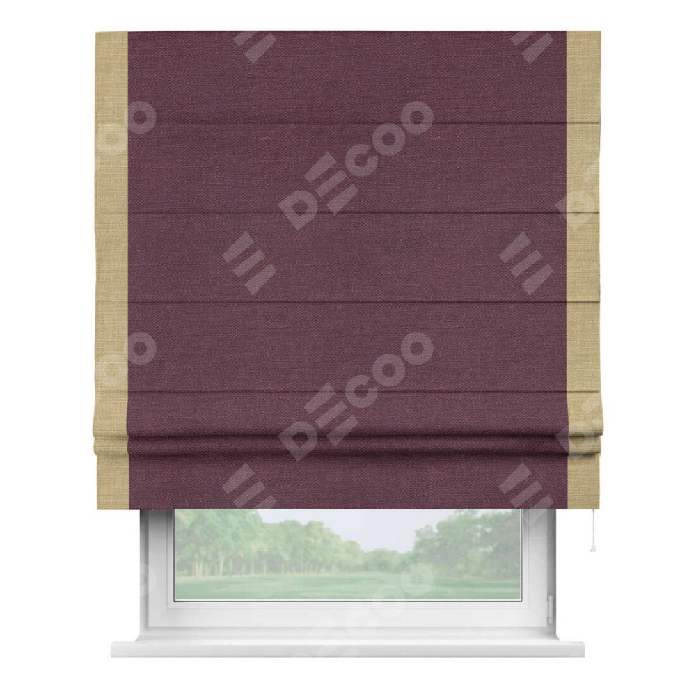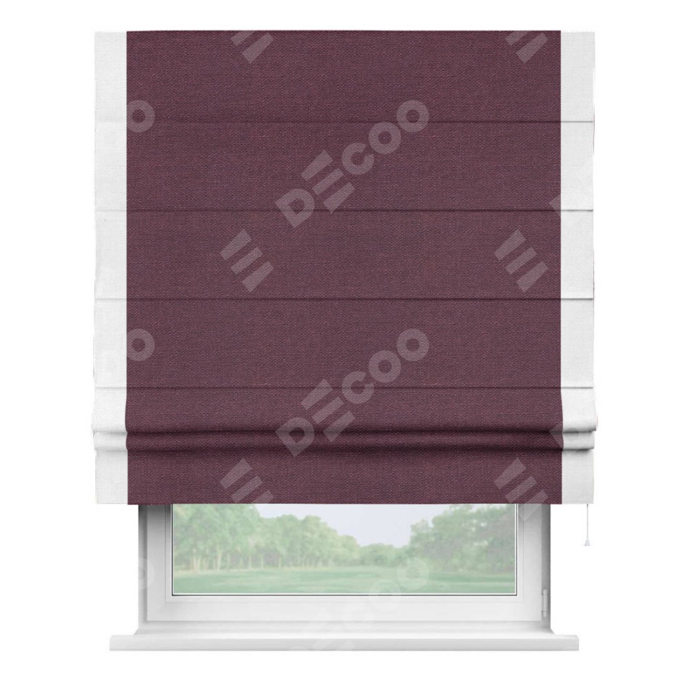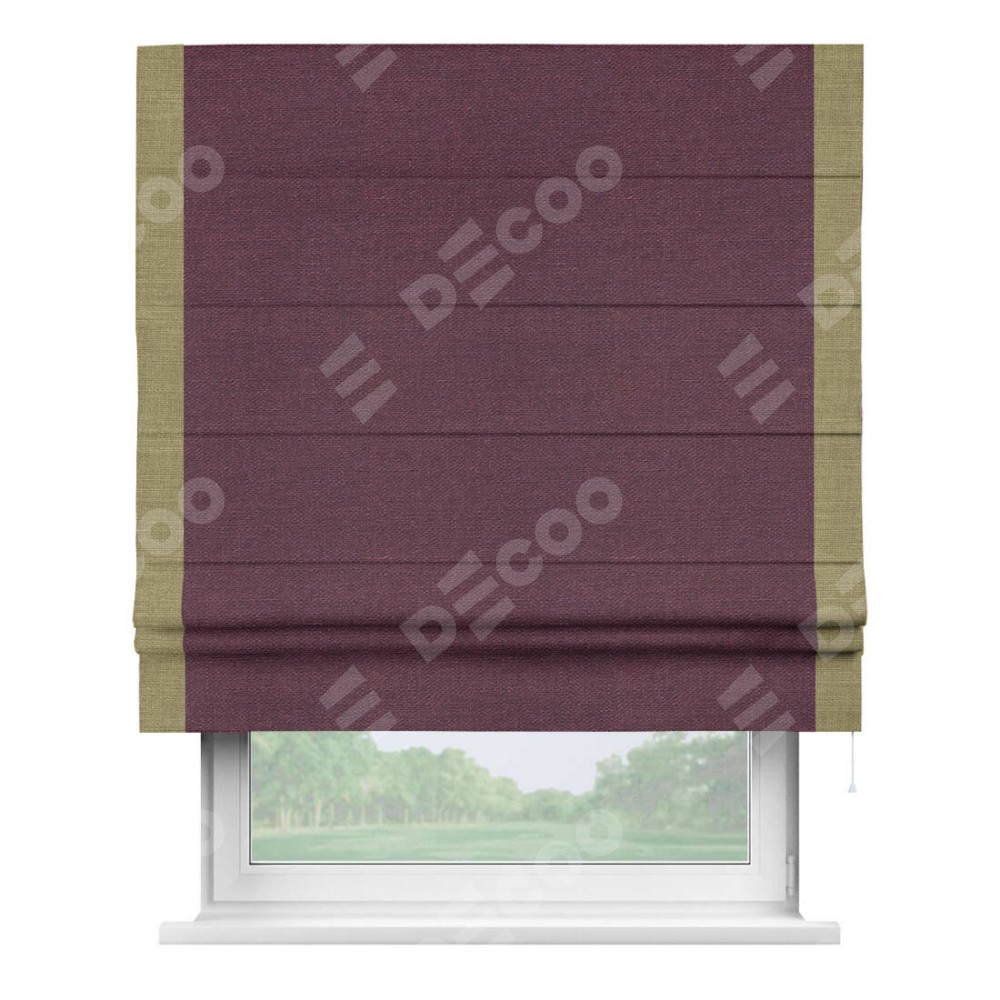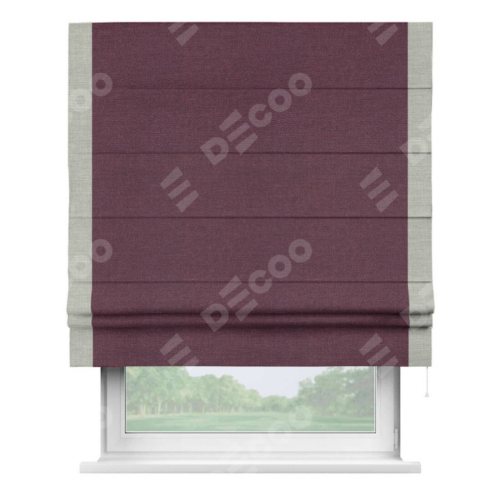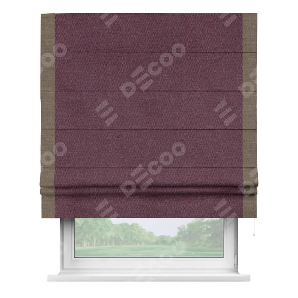 Римская штора производителя «Cortin», используется для проёма, пошита из ткани лён фиолетовый, артикул 85907. Отделка шторы кантом «Стрим Дуо», ткань для канта используется из льна разной расцветки на выбор. Имеет универсальный механизм и подходит для монтажа: на потолок, на стену и в нишу.