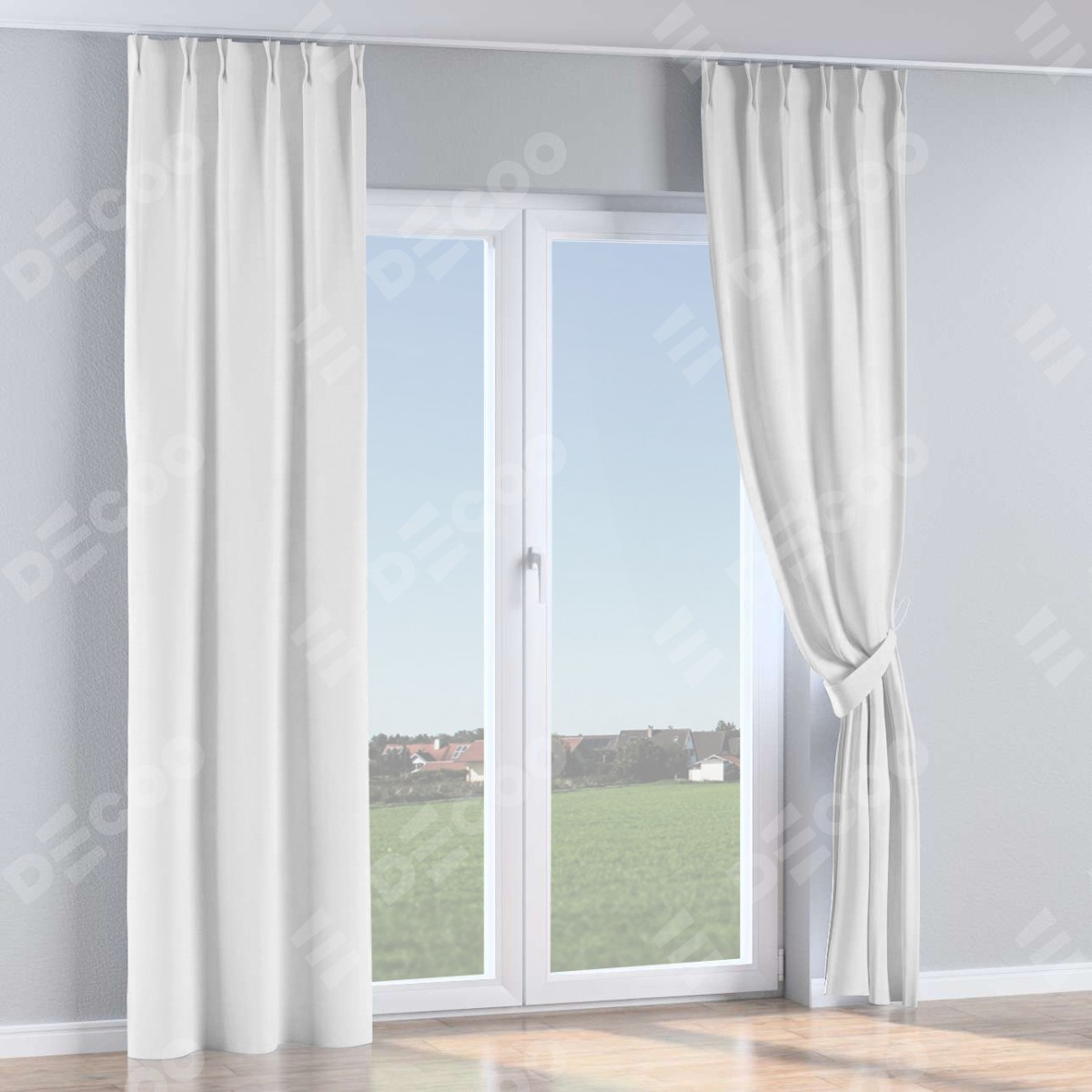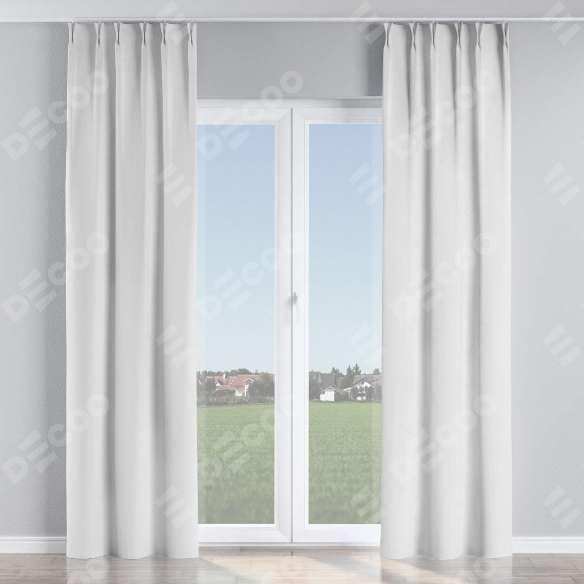 Комплект прямых штор, от производителя «Cortin», пошиты из ткани лён белый, артикул ткани 53430. С изнаночной стороны в верхней части штор пристрачивается шторная лента с декоративными складками «Кустик». Для создания элегантных складок прямые шторы шьются по стандарту с коэффициентом 1:2 (на 100 см. ширины проёма 200 см. ширины ткани).