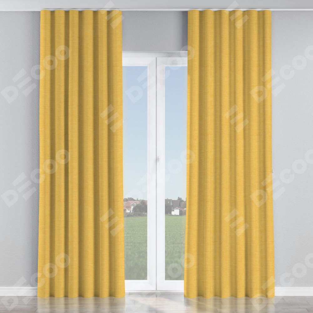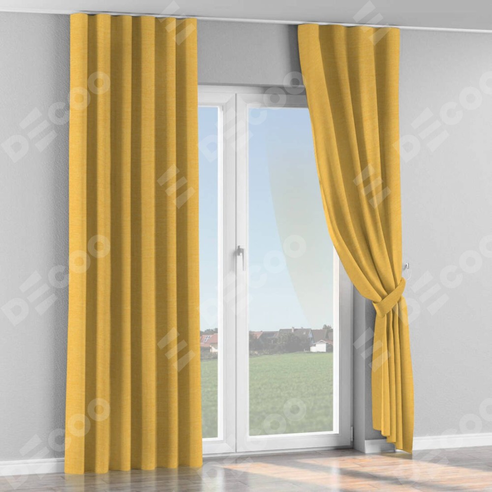Комплект прямых штор, от производителя «Cortin», пошиты из ткани лён желтый, артикул ткани 63738. С изнаночной стороны в верхней части штор пристрачивается шторная лента с декоративными складками «Волна». Для создания элегантных складок прямые шторы шьются по стандарту с коэффициентом 1:2 (на 100 см. ширины проёма 200 см. ширины ткани).