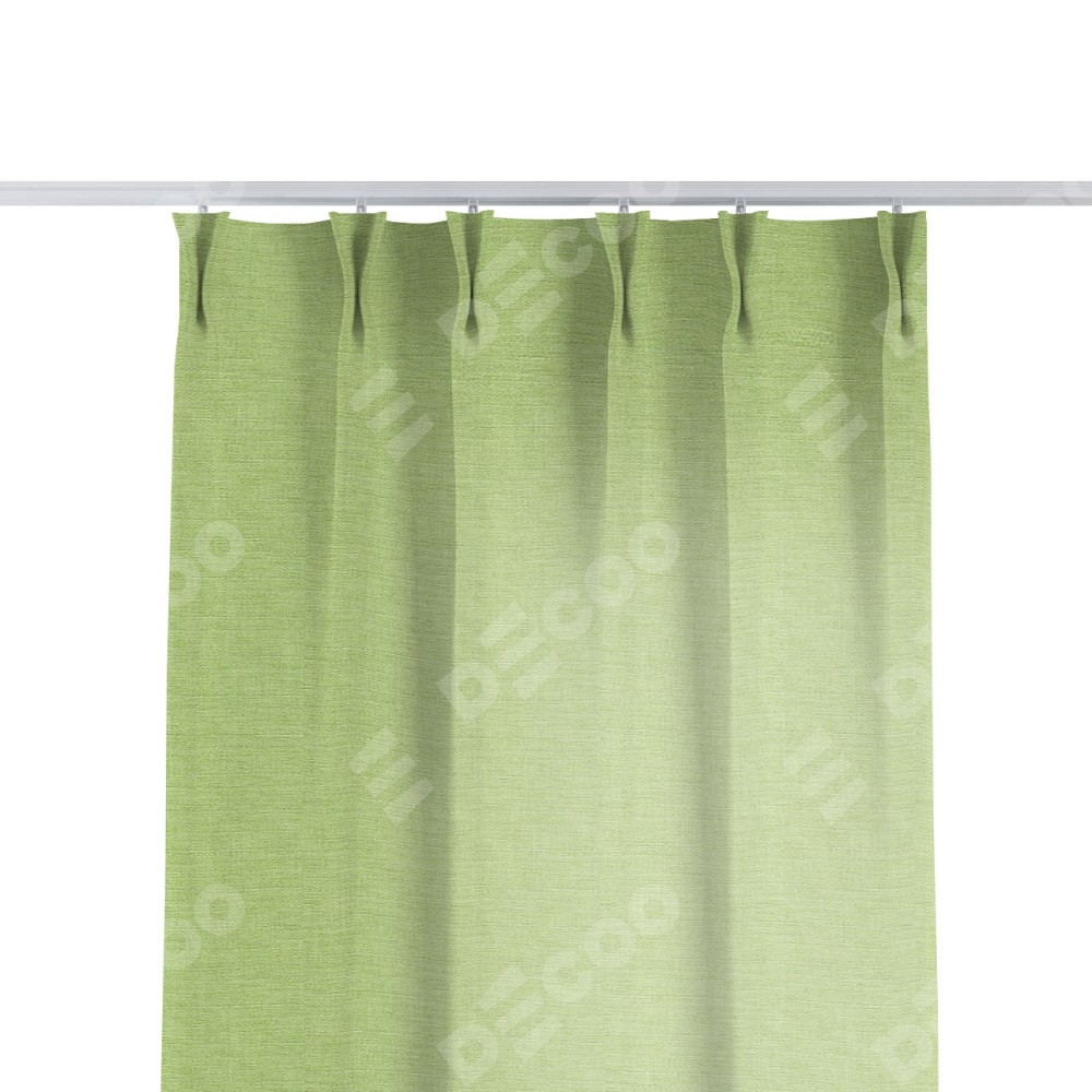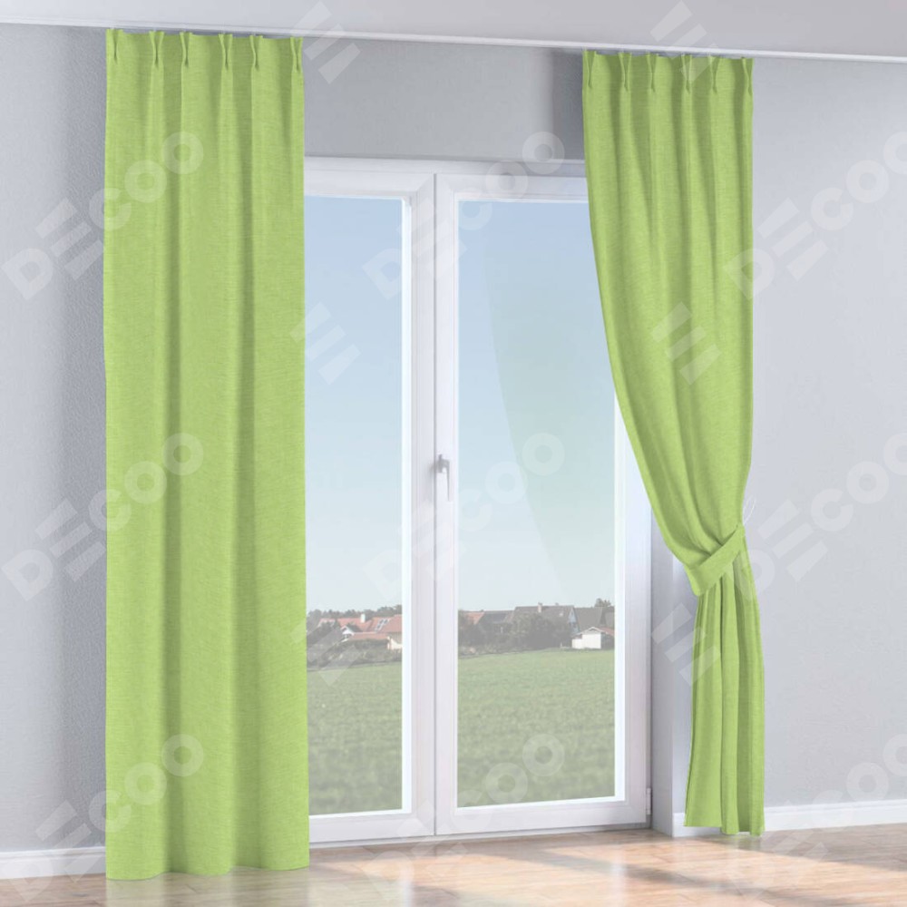 Комплект прямых штор, от производителя «Cortin», пошиты из ткани лён зелёный, артикул ткани 85906. С изнаночной стороны в верхней части штор пристрачивается шторная лента с декоративными складками «Кустик». Для создания элегантных складок прямые шторы шьются по стандарту с коэффициентом 1:2 (на 100 см. ширины проёма 200 см. ширины ткани).