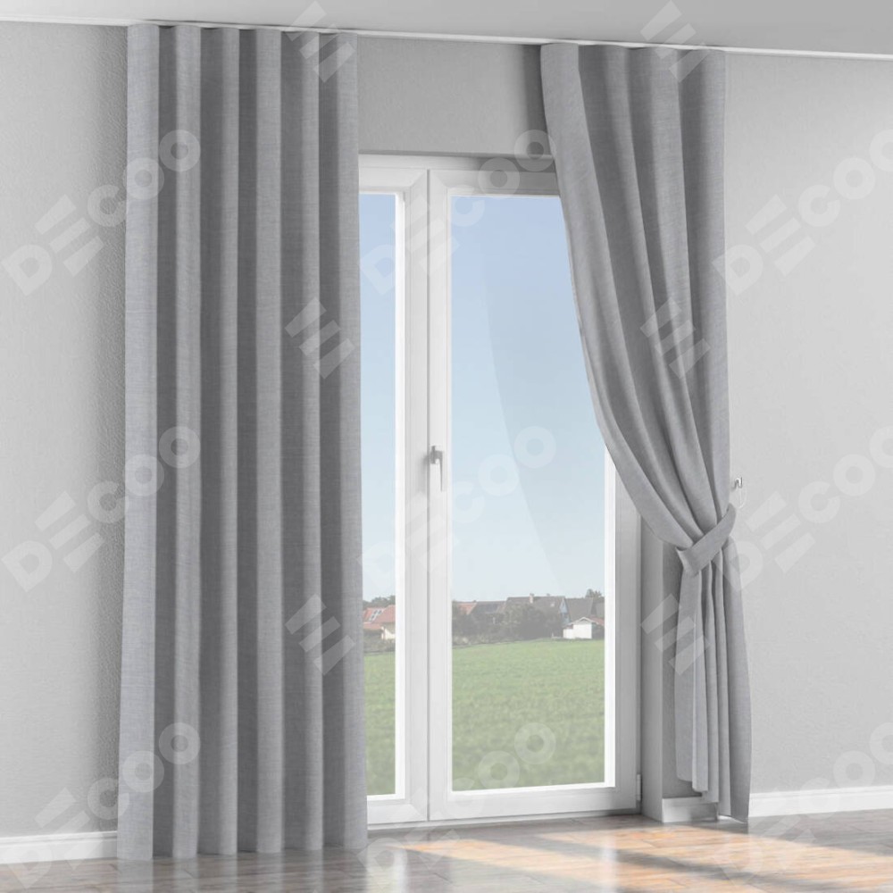 Комплект прямых штор, от производителя «Cortin», пошиты из ткани лён серый, артикул ткани 7440. С изнаночной стороны в верхней части штор пристрачивается шторная лента с декоративными складками «Волна». Для создания элегантных складок прямые шторы шьются по стандарту с коэффициентом 1:2 (на 100 см. ширины проёма 200 см. ширины ткани).