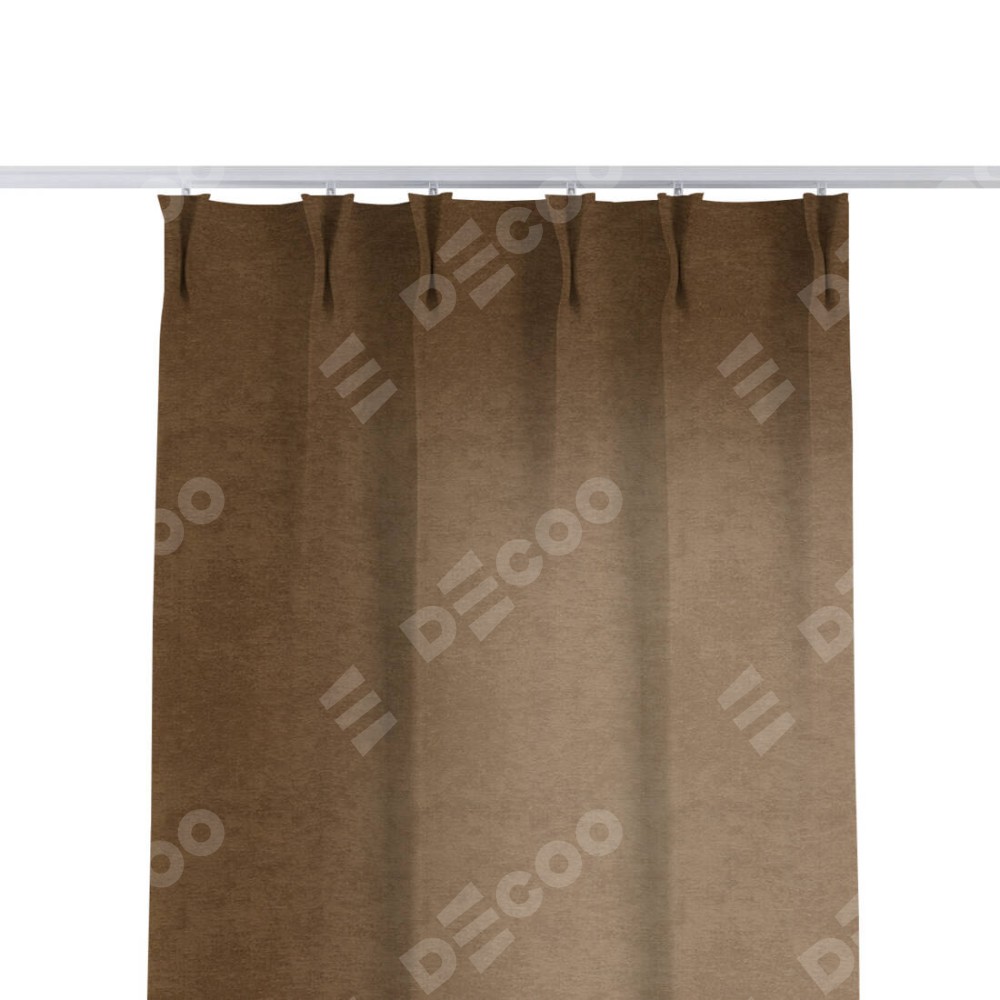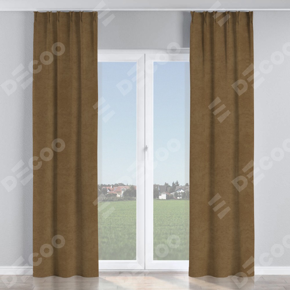 Комплект прямых штор, от производителя «Cortin», пошиты из ткани софт однотонный бронзовый, артикул ткани 33099. С изнаночной стороны в верхней части штор пристрачивается шторная лента с декоративными складками «Кустик». Для создания элегантных складок прямые шторы шьются по стандарту с коэффициентом 1:2 (на 100 см. ширины проёма 200 см. ширины ткани).