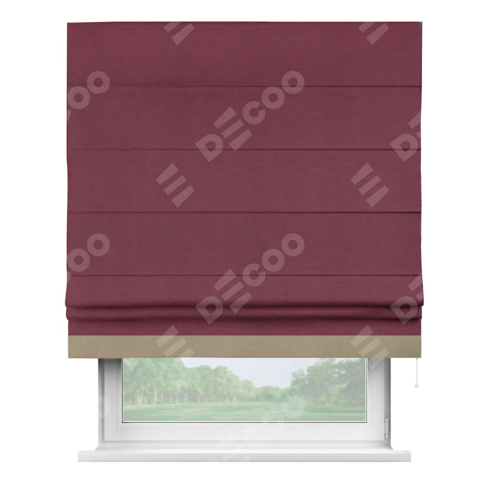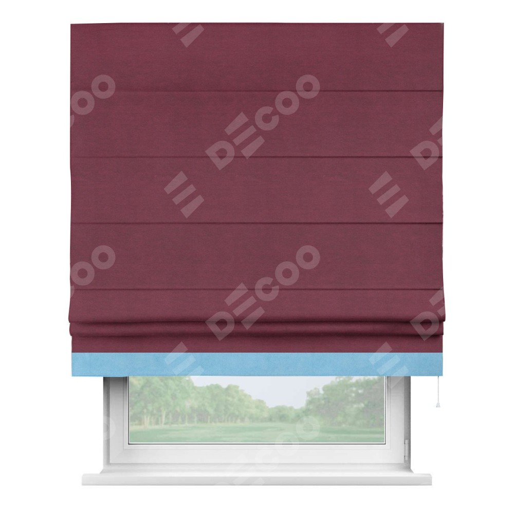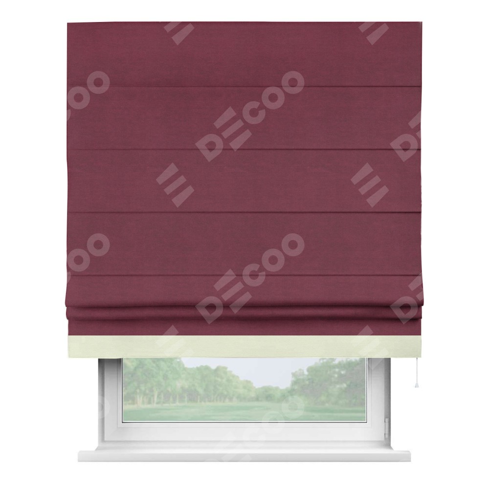 Римская штора производителя «Cortin», используется для проёма, пошита из ткани вельвет бордовый, артикул ткани 85553. Отделка шторы кантом «Джестер», ткань для канта используется из вельвета разной расцветки на выбор. Имеет универсальный механизм и подходит для монтажа: на потолок, на стену и в нишу.