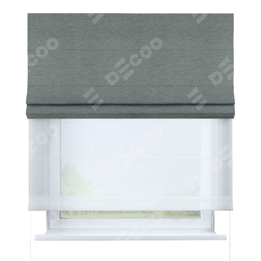 Римская штора день-ночь производителя «Cortin», используется для проёма, пошита из двух полотен, с лицевой стороны твид блэкаут серый артикул 21577, вторая ткань тюль (по стандарту комплектуется тюль белого цвета артикул V-01). Имеет универсальный механизм и подходит для монтажа: на потолок, на стену и в нишу.