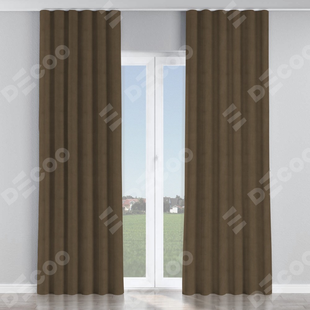 Комплект прямых штор, от производителя «Cortin», пошиты из ткани бархат тёмно-коричневый, артикул ткани 5017. С изнаночной стороны в верхней части штор пристрачивается шторная лента с декоративными складками «Волна». Для создания элегантных складок прямые шторы шьются по стандарту с коэффициентом 1:2 (на 100 см. ширины проёма 200 см. ширины ткани).