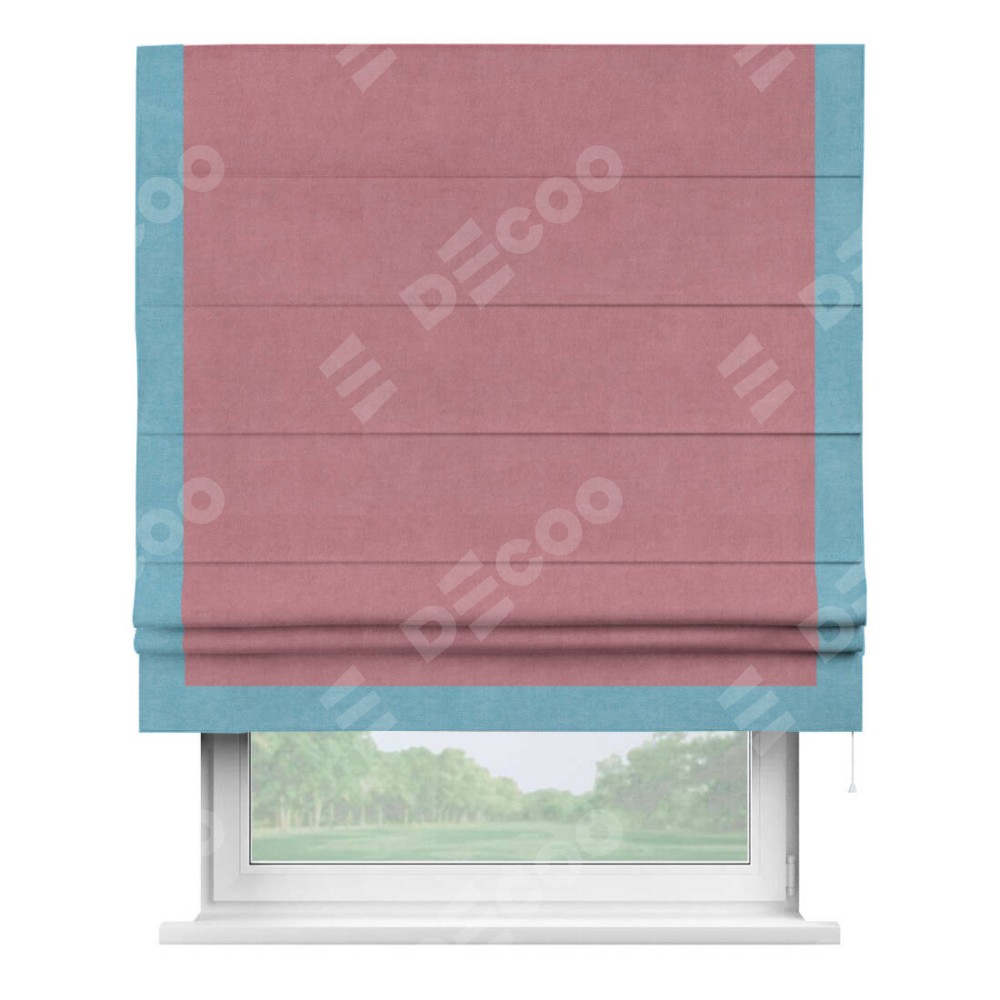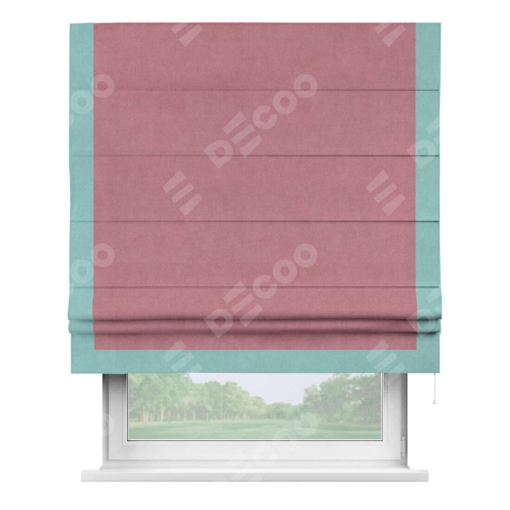 Римская штора производителя «Cortin», используется для проёма, пошита из ткани вельвет брусника, артикул ткани 85550. Отделка шторы кантом «Виктория», ткань для канта используется из вельвета разной расцветки на выбор. Имеет универсальный механизм и подходит для монтажа: на потолок, на стену и в нишу.