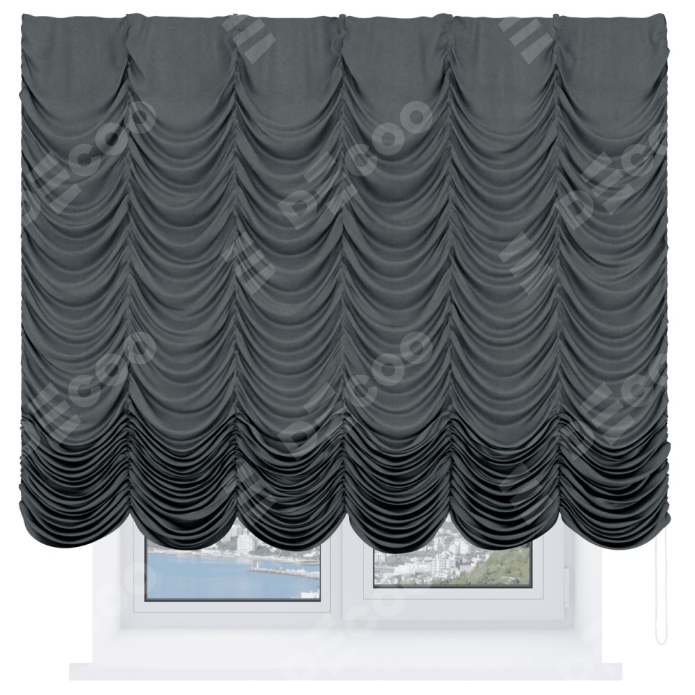 Французская штора производителя «Cortin», используется для проёма, пошита из ткани вельвет тёмно-серый, артикул ткани 85542. Имеет универсальный механизм и подходит для монтажа: на потолок и на стену.