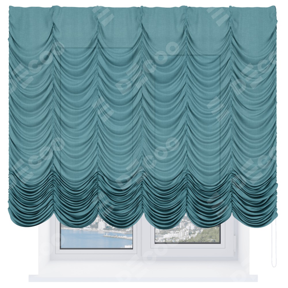 Французская штора производителя «Cortin», используется для проёма, пошита из ткани лён бирюза, артикул ткани 7446. Имеет универсальный механизм и подходит для монтажа: на потолок и на стену.
