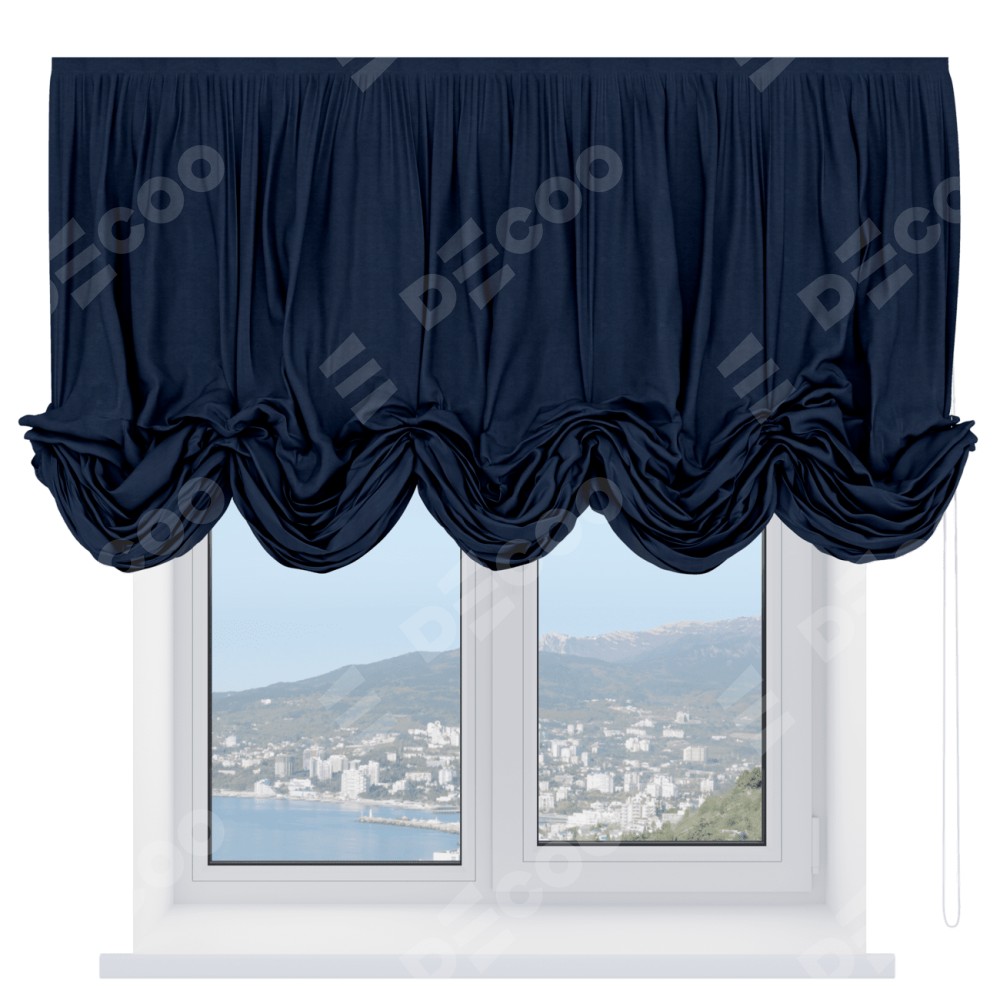 Австрийская штора производителя «Cortin», используется для проёма, пошита из ткани софт однотонный тёмно-синий, артикул ткани 33111. Имеет универсальный механизм и подходит для монтажа: на потолок и на стену.