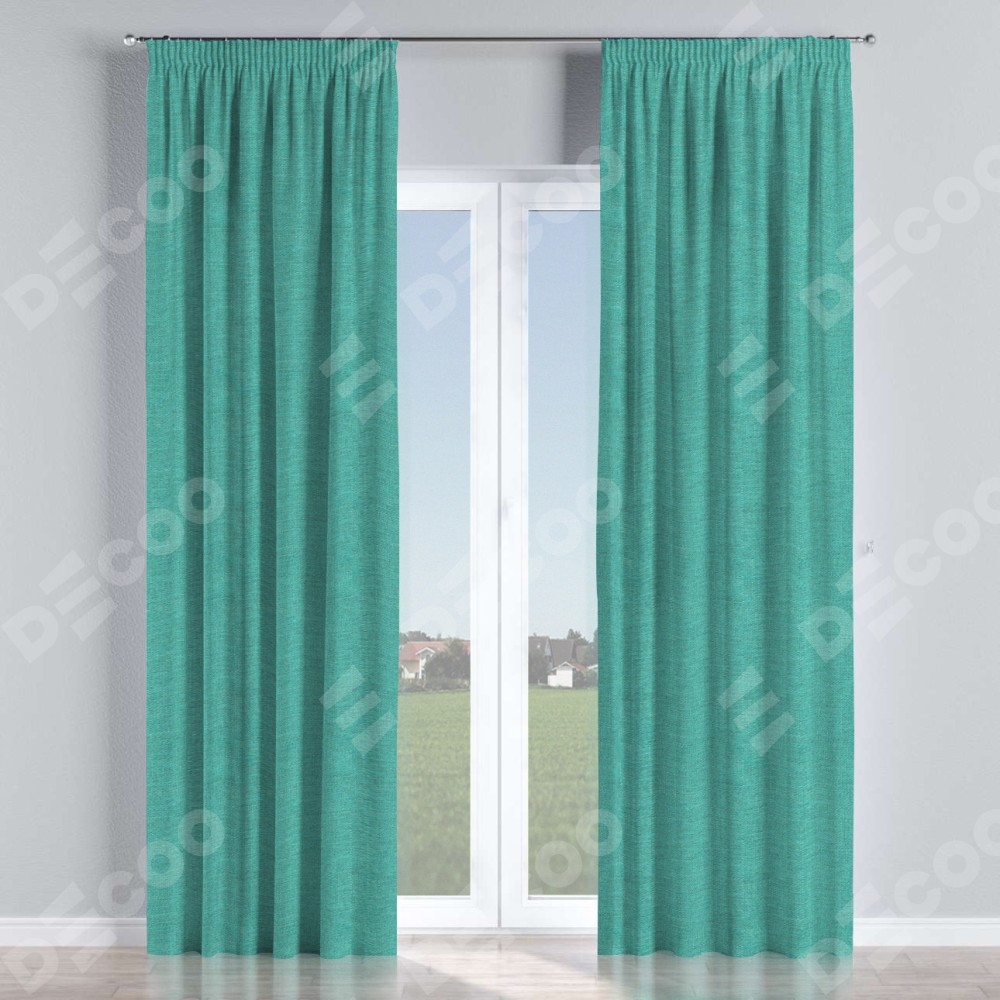 Комплект прямых штор, от производителя «Cortin», пошиты из ткани лён изумрудный, артикул ткани 85908. С изнаночной стороны в верхней части штор пристрачивается шторная лента с декоративными складками «Карандаш». Для создания элегантных складок прямые шторы шьются по стандарту с коэффициентом 1:2 (на 100 см. ширины проёма 200 см. ширины ткани).