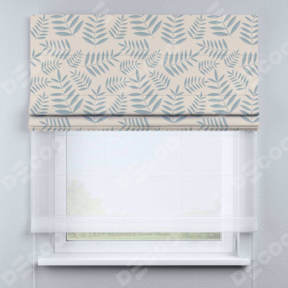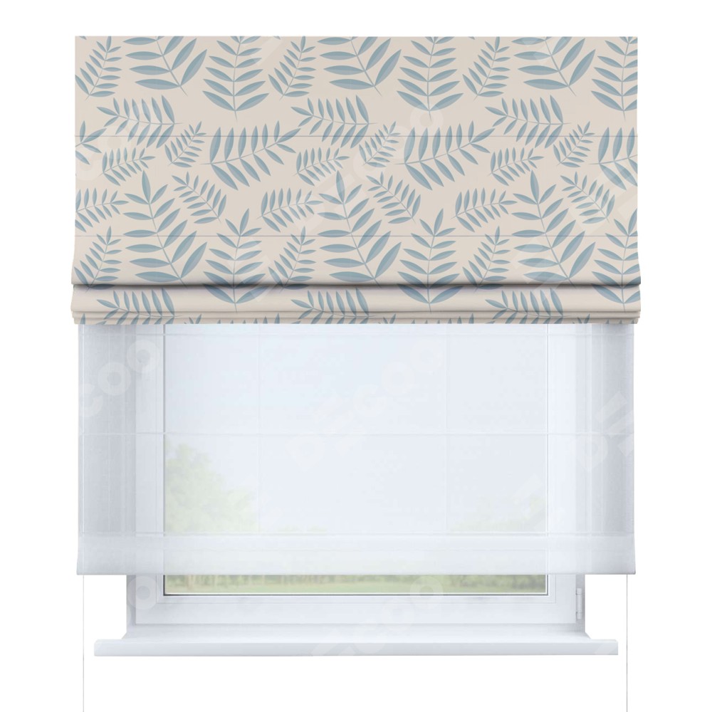 Римская штора день-ночь производителя «Cortin», используется для проёма, пошита из двух полотен, с лицевой блэкаут с нанесением сублимационной печати «Веточка с листочками», вторая ткань тюль (по стандарту комплектуется тюль белого цвета артикул V-01). Имеет универсальный механизм и подходит для монтажа: на потолок, на стену и в нишу.