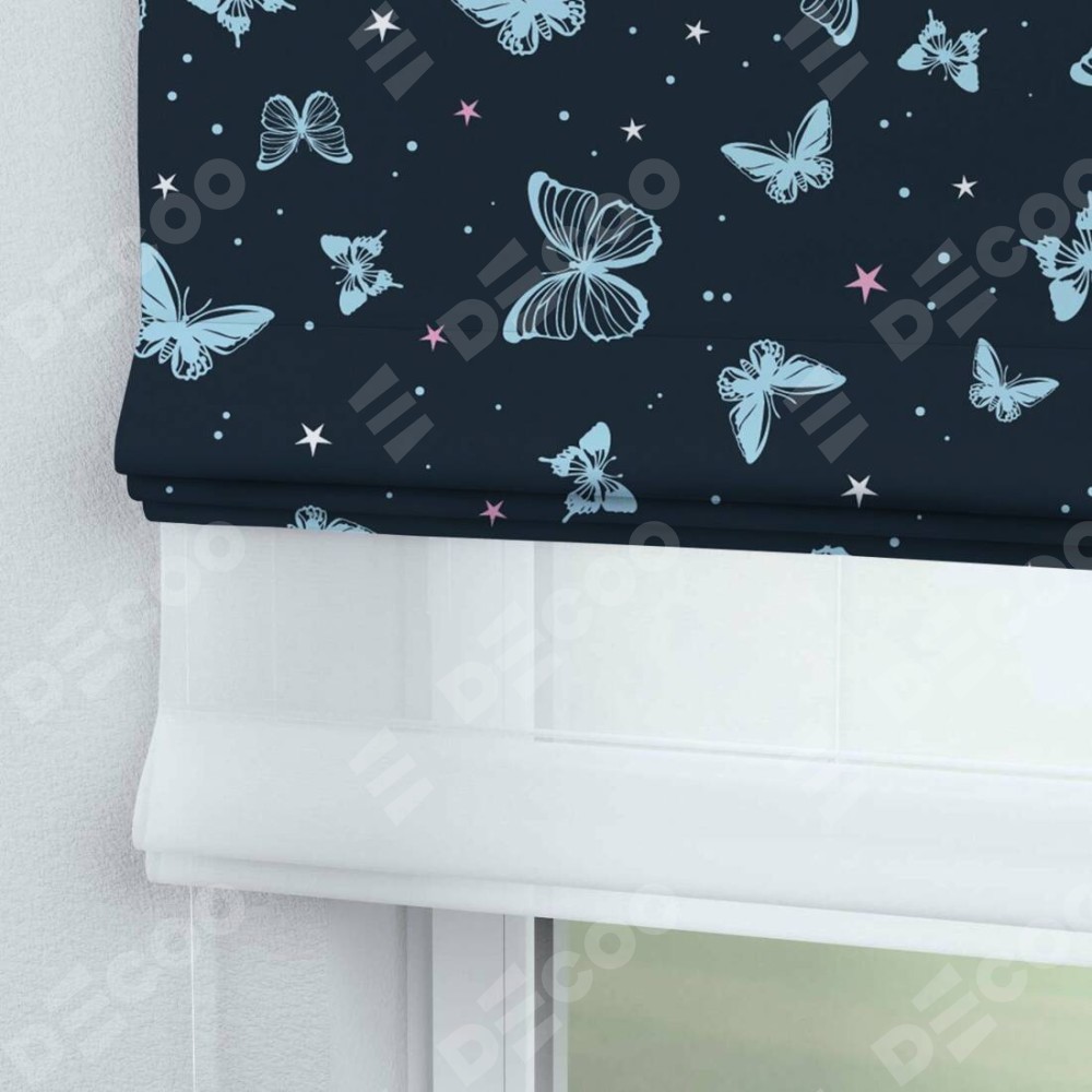 Римская штора день-ночь производителя «Cortin», используется для проёма, пошита из двух полотен, с лицевой блэкаут с нанесением сублимационной печати «Неоновые бабочки», вторая ткань тюль (по стандарту комплектуется тюль белого цвета артикул V-01). Имеет универсальный механизм и подходит для монтажа: на потолок, на стену и в нишу.