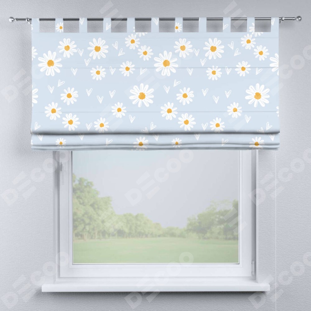 Римская штора производителя «Cortin», используется для проёма, пошита из ткани блэкаут с нанесением сублимационной печати «Летние ромашки». Данная модель пошита на петлях, комплектуется на выбор круглым карнизом и подходит для монтажа на стену. Римская штора на петлях имеет простую систему регулировки высоты, отличительным преимуществом данной модели является простой способ монтажа. Достаточно повесить ее на трубу и штора готова!