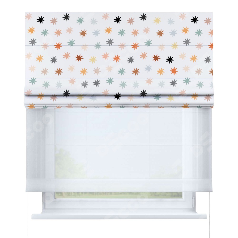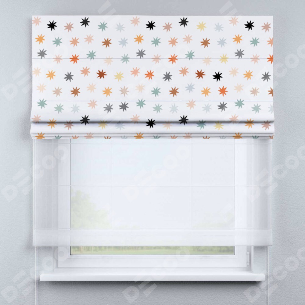 Римская штора день-ночь производителя «Cortin», используется для проёма, пошита из двух полотен, с лицевой блэкаут с нанесением сублимационной печати «Разноцветные звёзды», вторая ткань тюль (по стандарту комплектуется тюль белого цвета артикул V-01). Имеет универсальный механизм и подходит для монтажа: на потолок, на стену и в нишу.